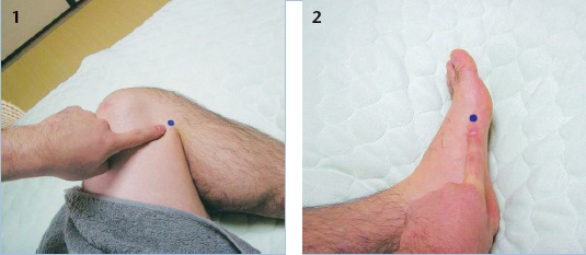 “Bend your knee so that a line appears (1). Identify the “line end point” (2) and massage that area firmly for round five minutes. If the problem persists repeat the treatment.”