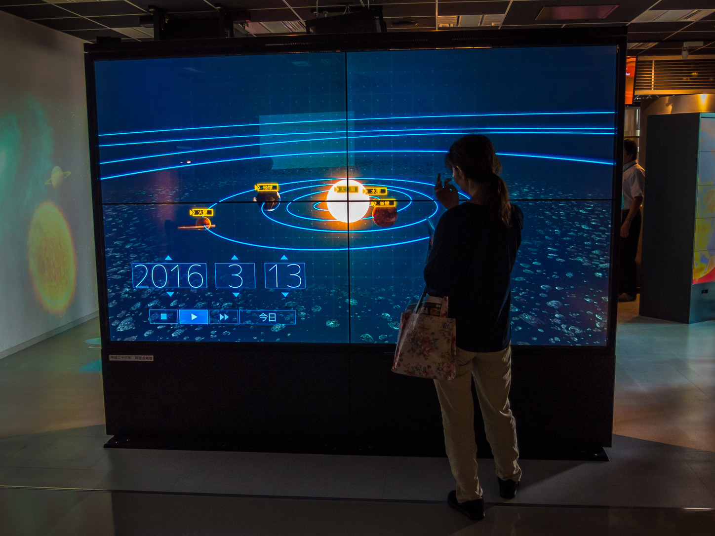 Moving on you get to walk on earth’s solar system as filmed through telescopes and projected on the wall and the floor—this is less exciting than it sounds but makes a nice environment for the Messiah Valkyrie. After that follows a giant touch screen that looks as if it has been lifted off a spaceship bridge, offering information about the solar system, complete with real imagery and all kinds of scientific data; the interface designed by the CIT people is a nice balance between science and SciFi and even though you could say it’s just a (very) glorified tablet, it’s quite addictive!