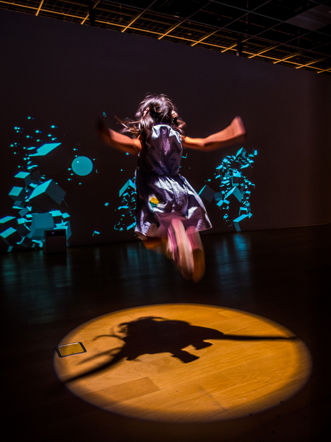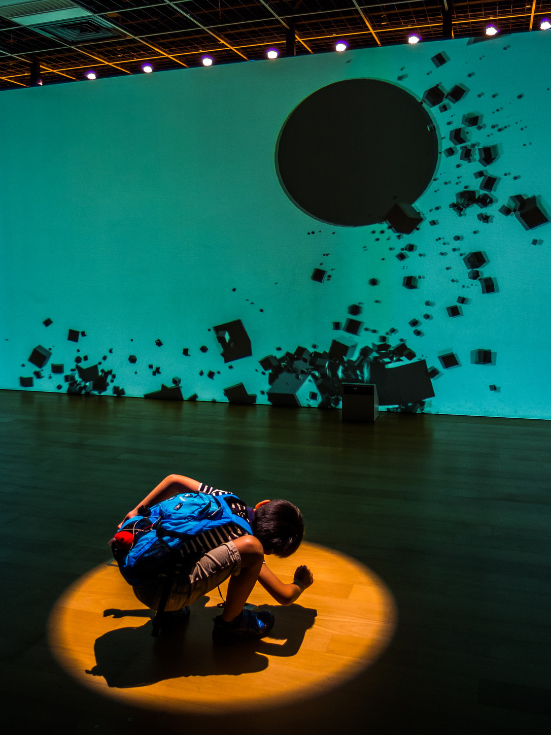 Passing lightly from a case with the world’s only katana forged from a meteorite (say what?!) we get to the main room and can see a rescue robot in action (his brothers and sisters are at the moment working the Fukushima Daiichi Nuclear Power Plant—yes, that power plant), fly over the moon (again, imagery projected on the floor and walls), play football with planets and make them crash on each other in a room-shaped screen, see how regular sheets of paper get transformed into tablets and control our robotic shadow. This last part where the visitor’s movements get caught by sensors and get projected in the form of cubes on a long wall-screen is probably among the campus favorites.