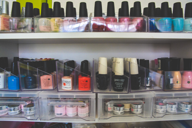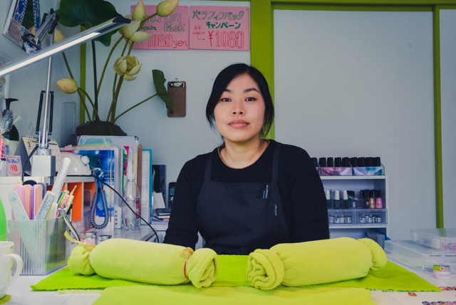 Asagami is given the reins, now, to add her own flair as the final touch to the nails. She happily seizes a nearby brush, and, unflinchingly, swirls it across the nails. She flirts with the brush, waiting until the last second before the gel drips, to paint. She always catches, and hasn’t once strayed beyond the nail. “My very first day, at a different salon, years ago, I forgot to [soften] the nail file, and accidentally sliced my client’s finger. I haven’t made a single mistake since.” She shudders, shaking her head vigorously as if to get the memory out of her mind.