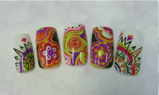 “I have been painting my whole life. My parents weren’t surprised when I chose to study art in university to be an illustrator for children’s books, but they were surprised when I decided to be a nail artist.” Asagami admits she isn’t as interested in fashion as people suspect she is, “[but] I like to express myself through my nail art.” Her own nails are a jumble of colors and designs, “because I’m doing interviews for new artists to join our salon.”