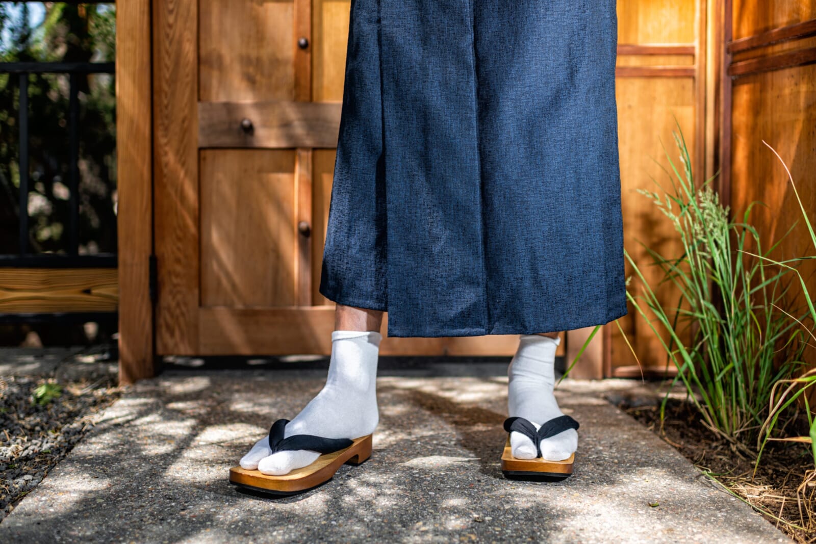 For footwear, men can typically choose from three types of sandals. Geta are wooden platform sandals, zori are flat cork-based sandals and setta are flat woven bamboo sandals. These sandals are worn with tabi split-toe socks or barefoot.