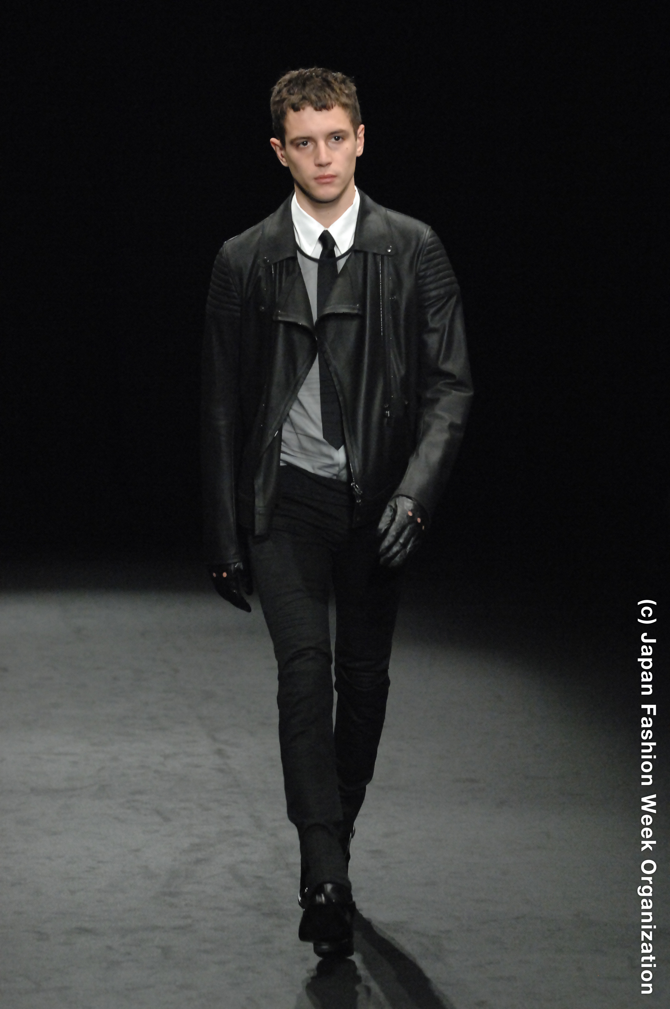 Motonari Ono, always popular with fans, once again went for a sexy, chic look of feminine details paired with menswear-inspired tailoring. Tuxedo jackets and military-inspired coats were softened by lace insets and lapels, and then paired with miniskirts and thigh-high stockings for a seductive look.