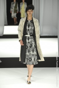 Naomi Yamamoto of Tiny Dinosaur debuted a relaxed yet stylish collection of silk and jersey dresses, chiffon tops and cotton trench coats with Japanese influences. Many of the prints have a kimono look to them, and several pieces crossed in the front and tied like yukatas. But these were mixed with skinny jeans and short shorts to keep the looks modern and wearable.