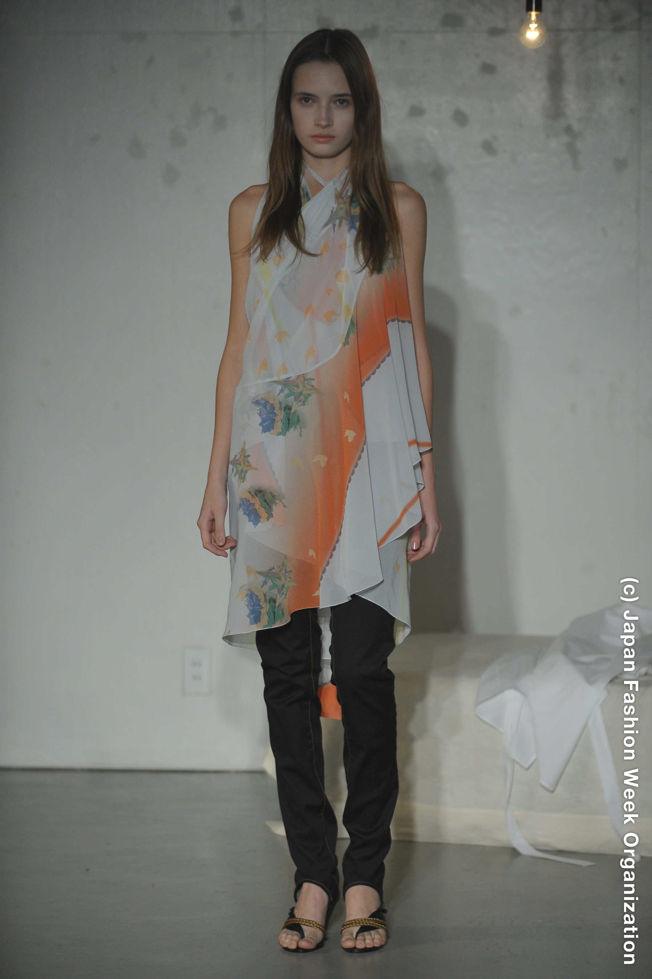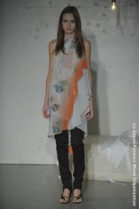Toshikazu Iwaya gained fame when he launched the popular brand Dresscamp, and for Dress33 he showed a colorful collection of men’s and women’s wear that included metallic dresses, giant belt buckles, and sports influences, such as running tights by Asics. Accented by a spattering of gold studs and fabrics with interesting textures, then topped off with funky accessories such as cellophane hair bows and feather earrings, the show was pure entertainment.