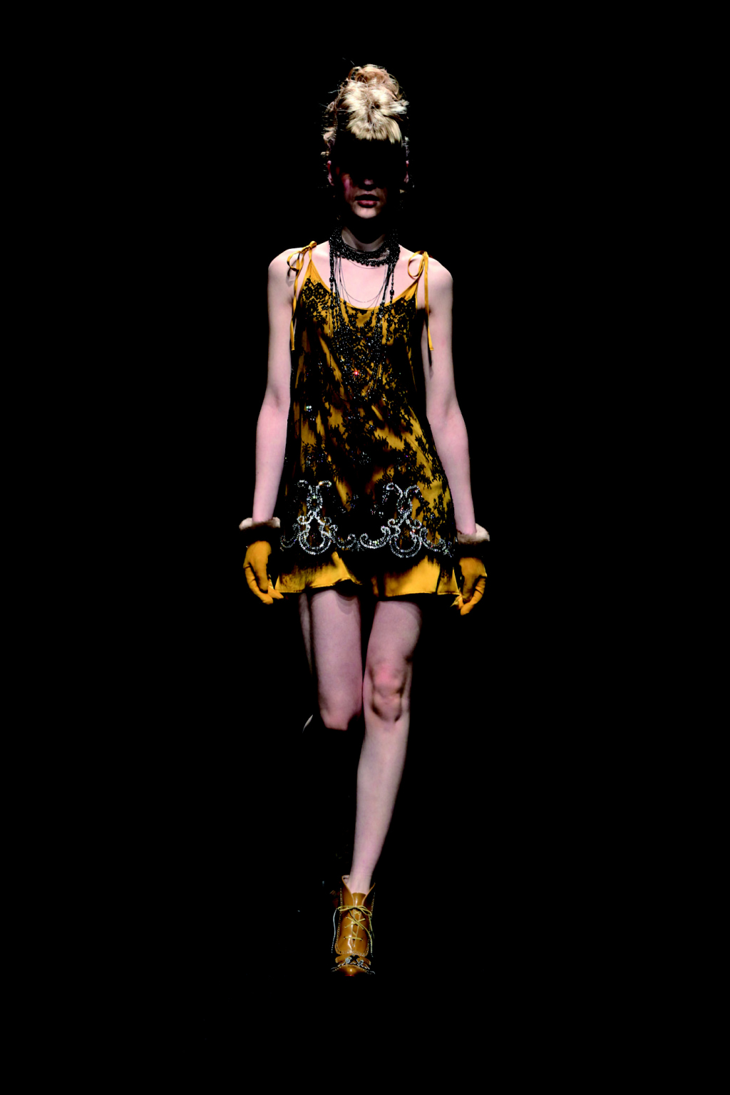 One of the week’s few non-Japanese participants, Han Ahn Soon provided a colorful alternative to the otherwise dark collections. Fur-trimmed tweed toggle coats, embroidered peasant dresses and lace shifts were accented with ethnic extras such as African-style beading and Eastern European-influenced embroidery.