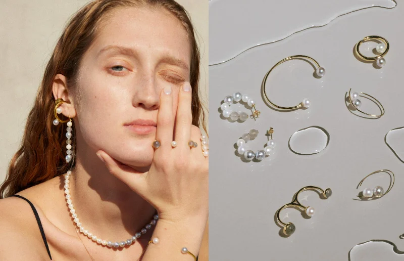 Highlights include the Surge Ring, where an elongated pearl stretches across two fingers, and the Cropped Pearl Necklace, featuring an irregular, one-of-a-kind pearl on a delicate sterling silver chain.