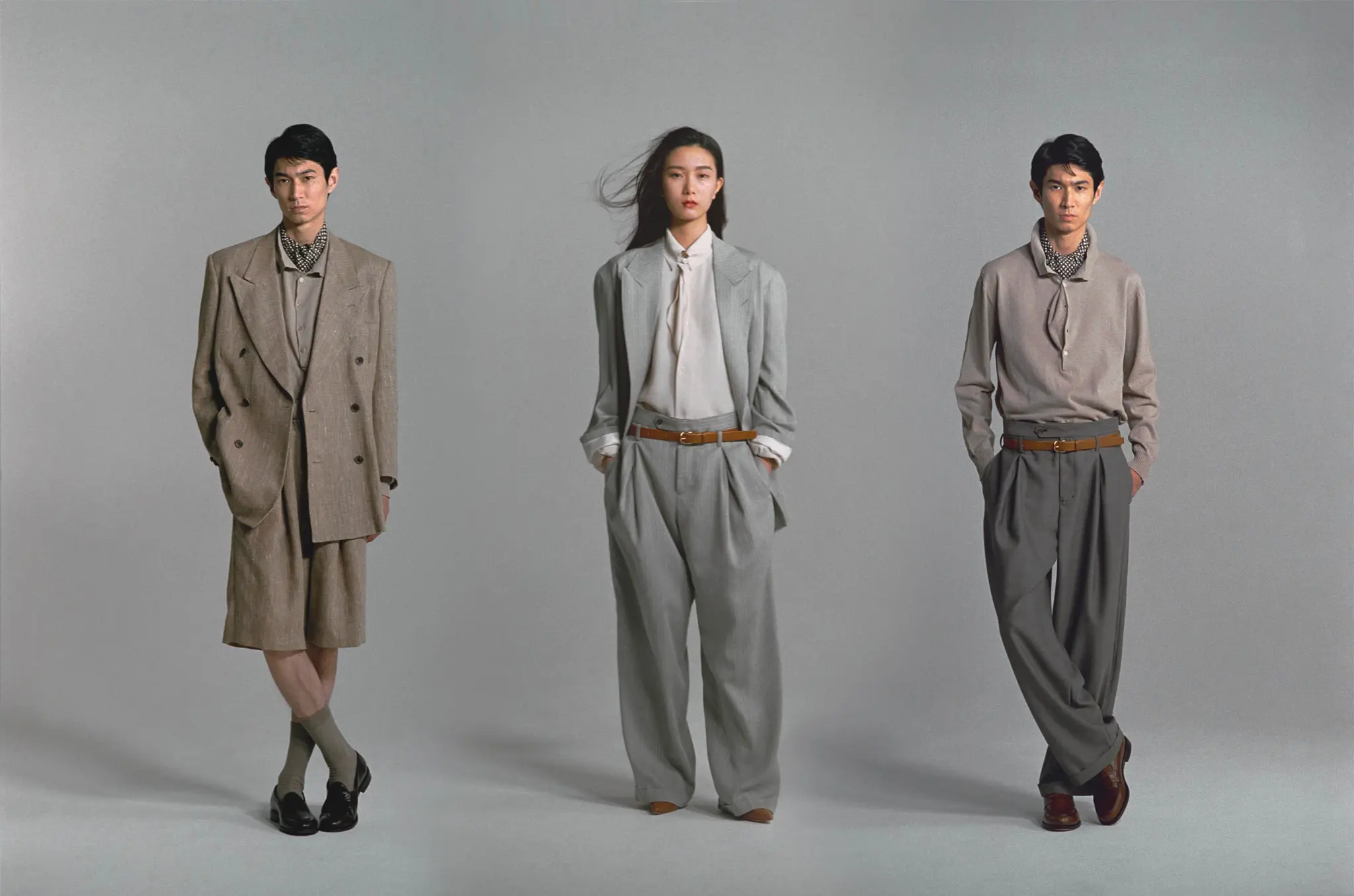 Soshi Otsuki’s impeccably tailored suits draw upon the “sewer-rat” power suits that Japanese salarymen wore in the 1980s — an era marked by a booming “bubble economy” and a surge in consumerism. Italian suits, made from expensive wool and often in a shade of brownish-grey, became hugely popular, seen in Tokyo’s bustling streets and subways. Otsuki cleverly pays homage to and subverts these Armani-inspired silhouettes, using elements reminiscent of traditional Japanese clothing, such as Kimono sleeve-inspired interlining pockets.