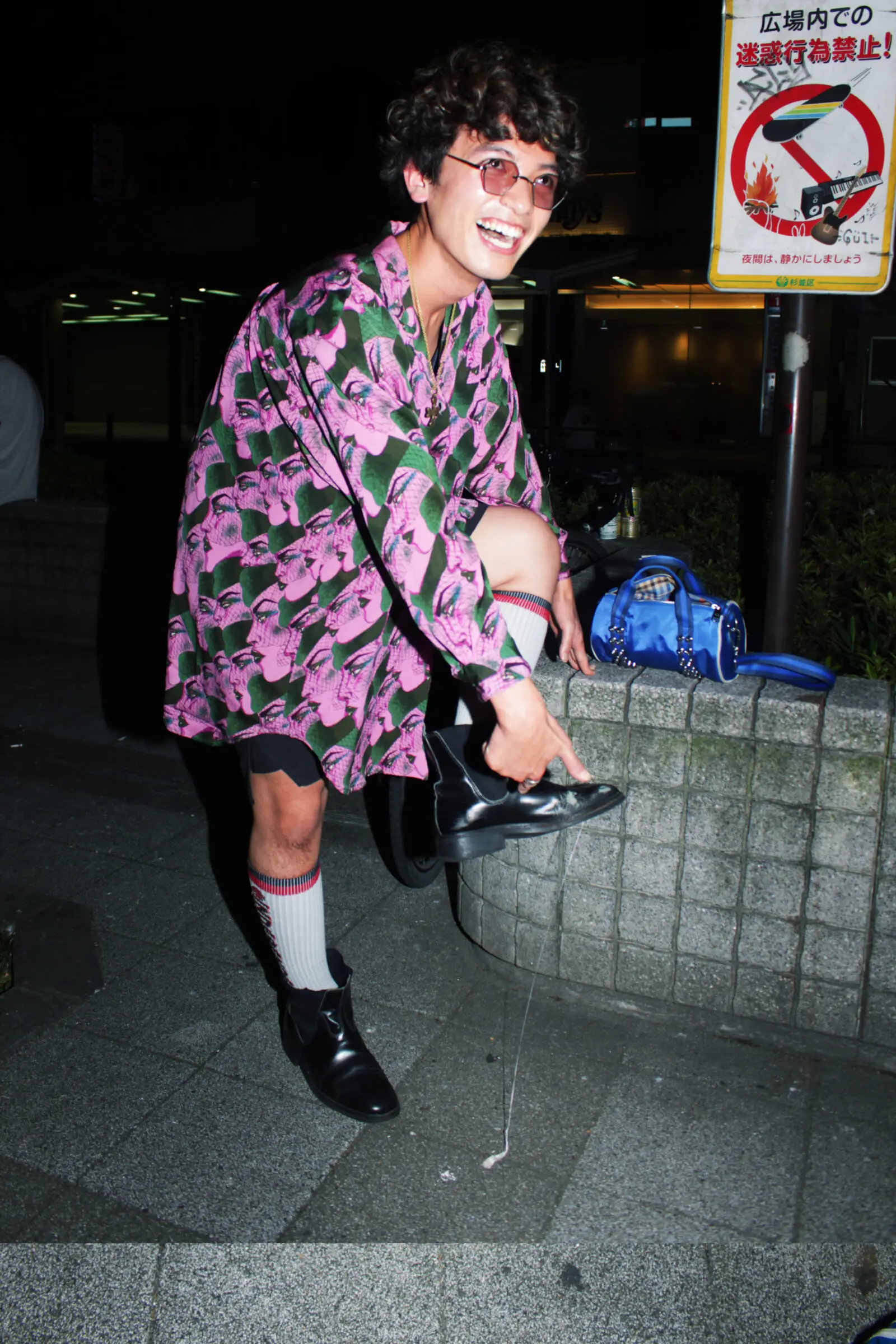Photographer Lilise agrees, and last year she set up the Instagram account “Koenji Fashion Snap” to capture the area’s unique and chaotic effervescence. Typically taken during the night and drenched in flash, Lilise’s shots capture the buzz of DIY culture like an after-hours lovechild of Fruits magazine and an indie sleaze-era house party. Yet despite obvious nods to Japan’s rich legacy of street fashion photography, her shots feel fresh.