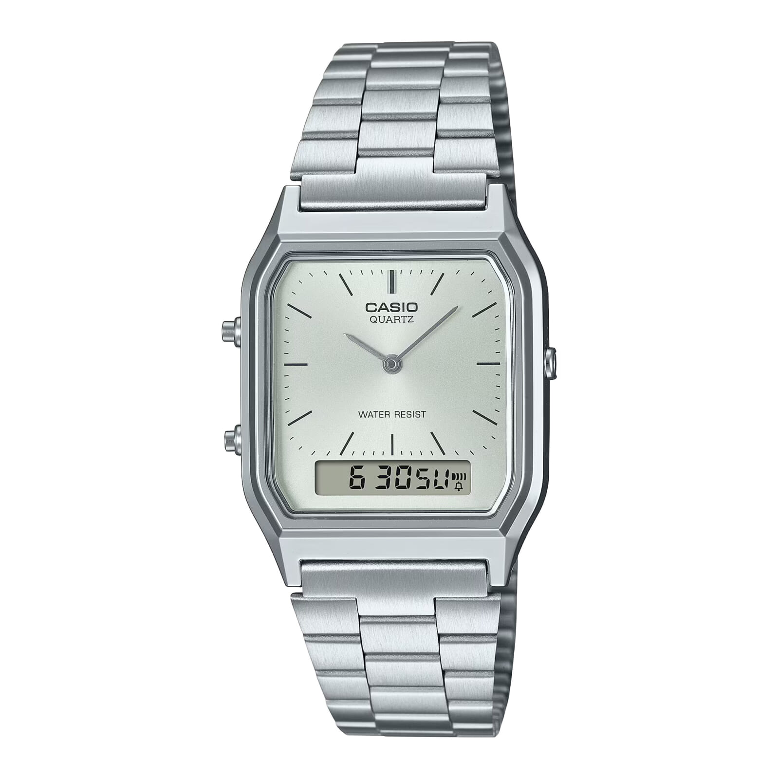 Casio’s first watch to combine digital and analogue displays, this model made waves for its unique aesthetic appeal. Its successor series, AQ-230, remains popular to this day. Our pick is this one with a silver band and silver face, perfect for minimalists.