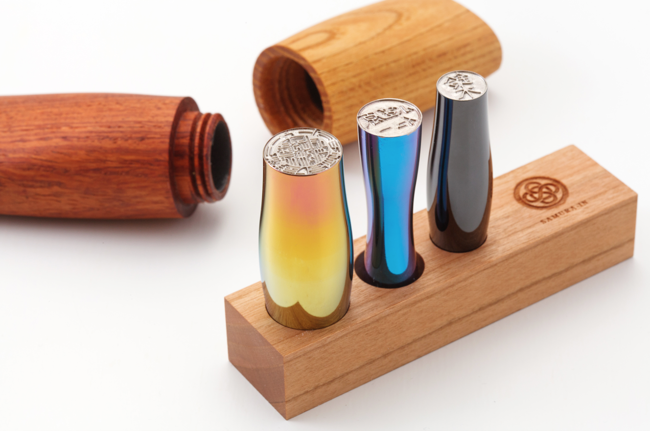 These personal seals are made of titanium, feature smooth curves, and can be carved with Western names upon request.