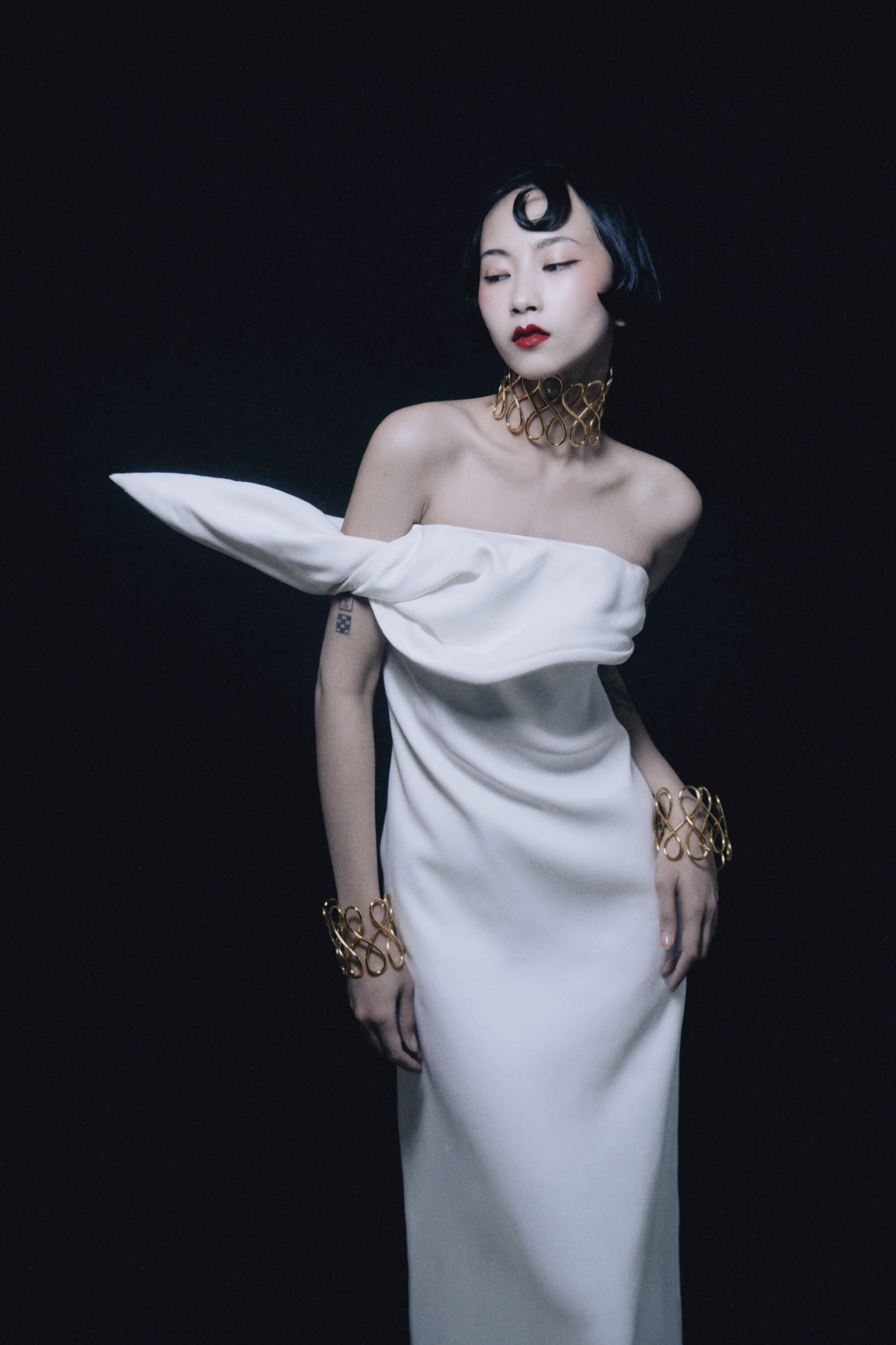Fetico, capturing the creative vision of designer Emi Funayama, emphasizes the beauty of the female form by reinterpreting classic styles. “Fetico embodies feminine strength, with sculptural pieces that make me feel both sexy and powerful,” Tiara says. Often inspired by vintage clothing and design sensibilities of enigmatic bygone eras, Funayama works in collaboration with Japanese textile producers and artisans.