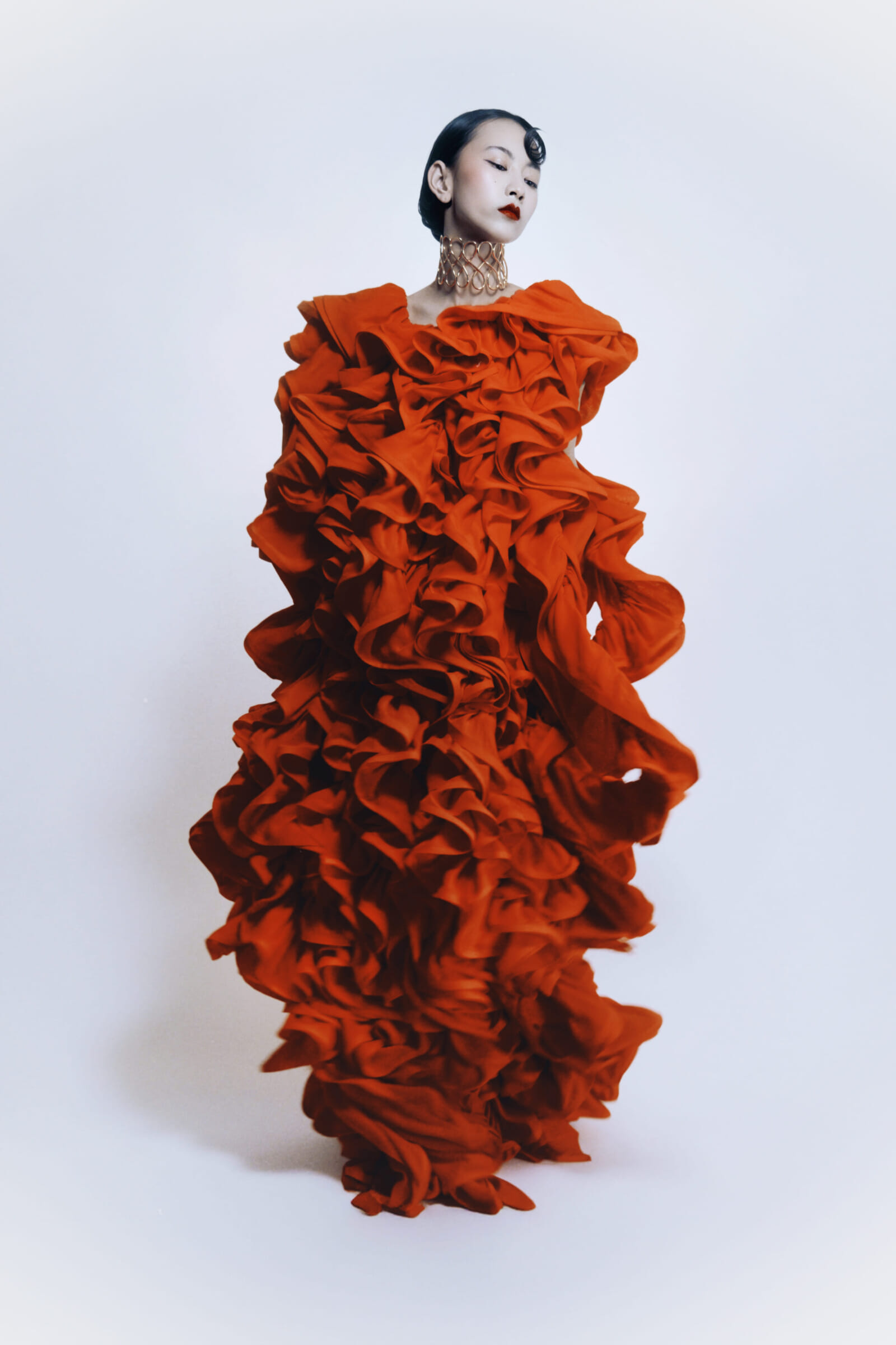 Since its inception in 2014, Ohno’s eponymous label has garnered attention for its evocative form-making and stylish practicality. “Lately, my focus has shifted toward how forms can seamlessly integrate into the everyday lives of the people who wear them,” he explains. Ohno’s deep curiosity toward the body as a site of expression is reflected in his experimental, sculptural designs that boldly challenge traditional definitions of femininity.