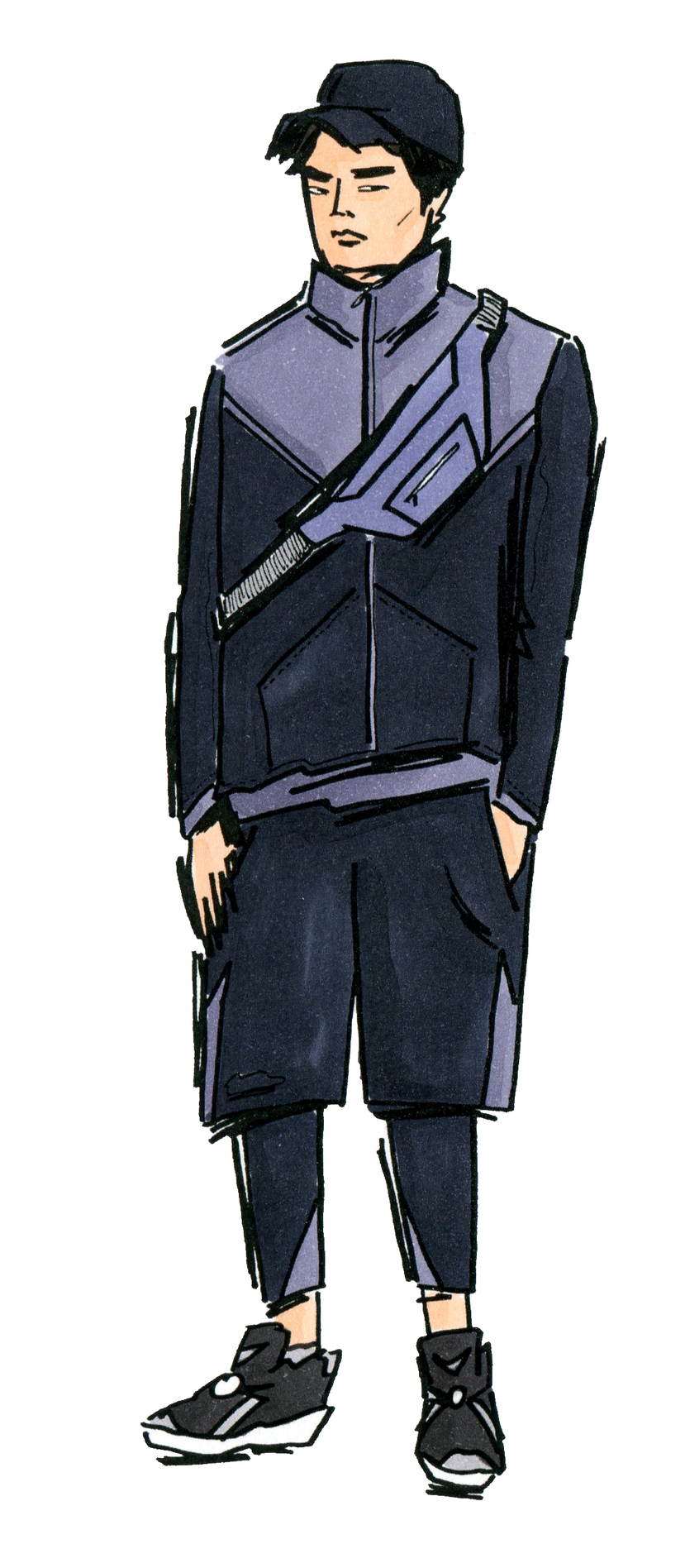 Key identifiers: Shorts over leggings, caps, windbreakers, stylish sneakers, a dog, depending on available pockets: no bag, money pouch, utility backpack