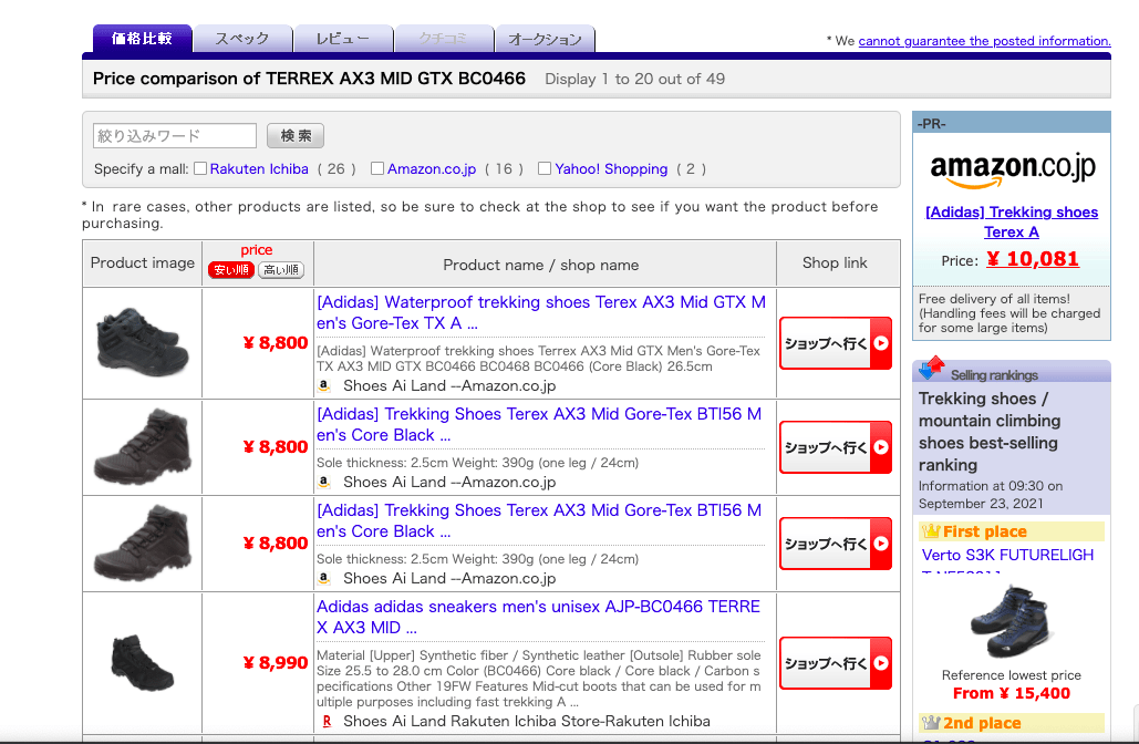 The most important rule of online shopping is to look out for the best deals and savings on different brands and websites. If I have my eyes on something particular like a pair of Adidas shoes, I visit price comparison sites. In Japan, that’s usually Kakaku.com. The website is quite simple to use and automatically translated thanks to Google translate. One must enter the product name (and code or style name for more precise results) to compare prices for the same item from different online retailers.