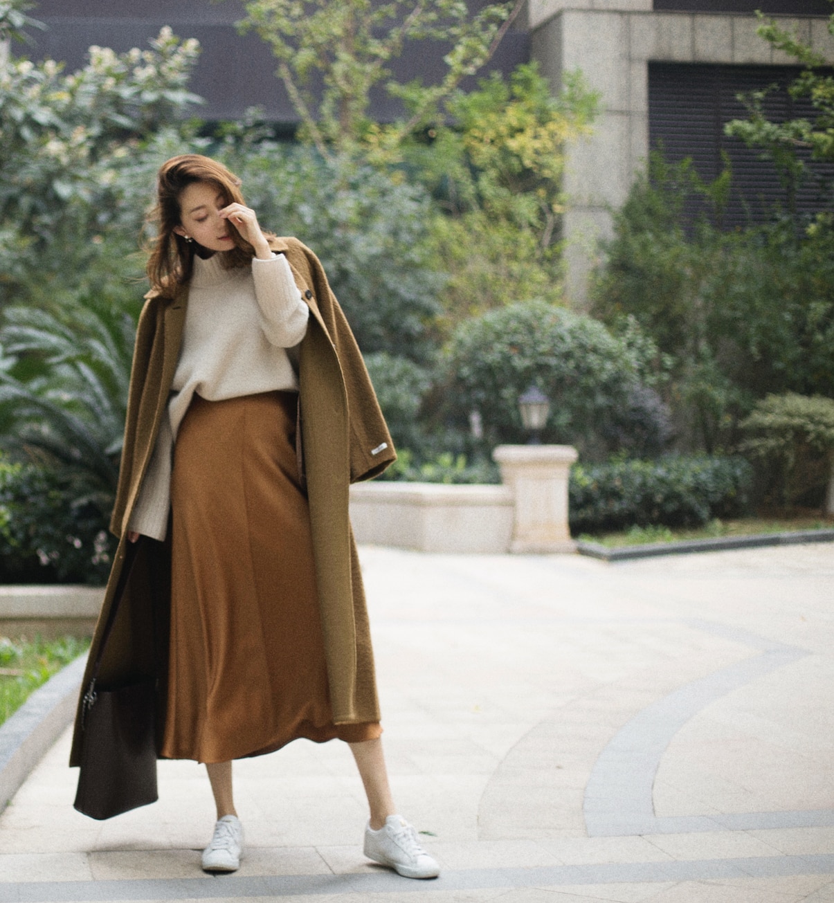 Long coat stylist’s own, sweater by Yangany, skirt by Parlmasel, shoes by Onitsuka Tiger