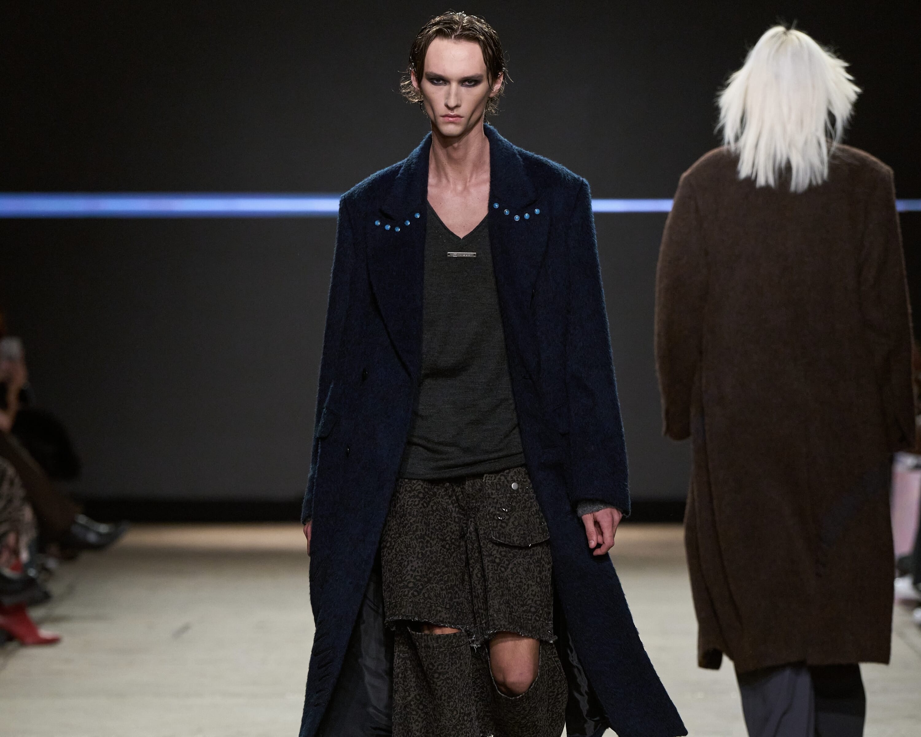 The models move fast. Faster than expected. Their boots strike the ground hard, in sync with the pulsing bassline that rattles throughout the warehouse. Leather jackets with collars yanked high, denim slashed and raw at the edges, a dissonance of textures: coarse wool against slick nylon, structured coats swallowing softer silhouettes underneath.