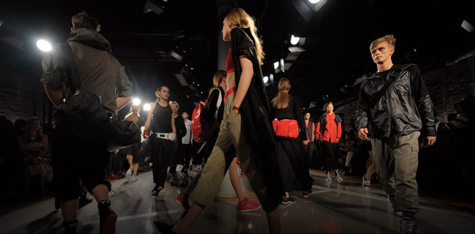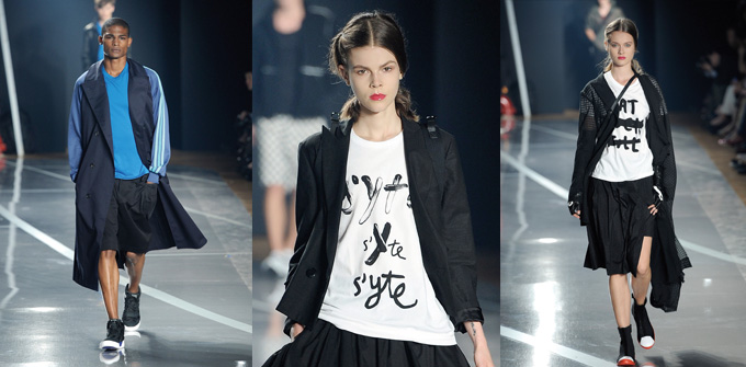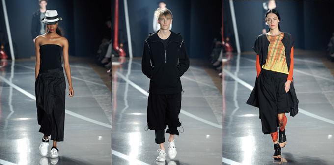 Offering sport as a theme, Y-3 presented unique takes on Olympic style, filtered through the street aesthetic of “London town”.