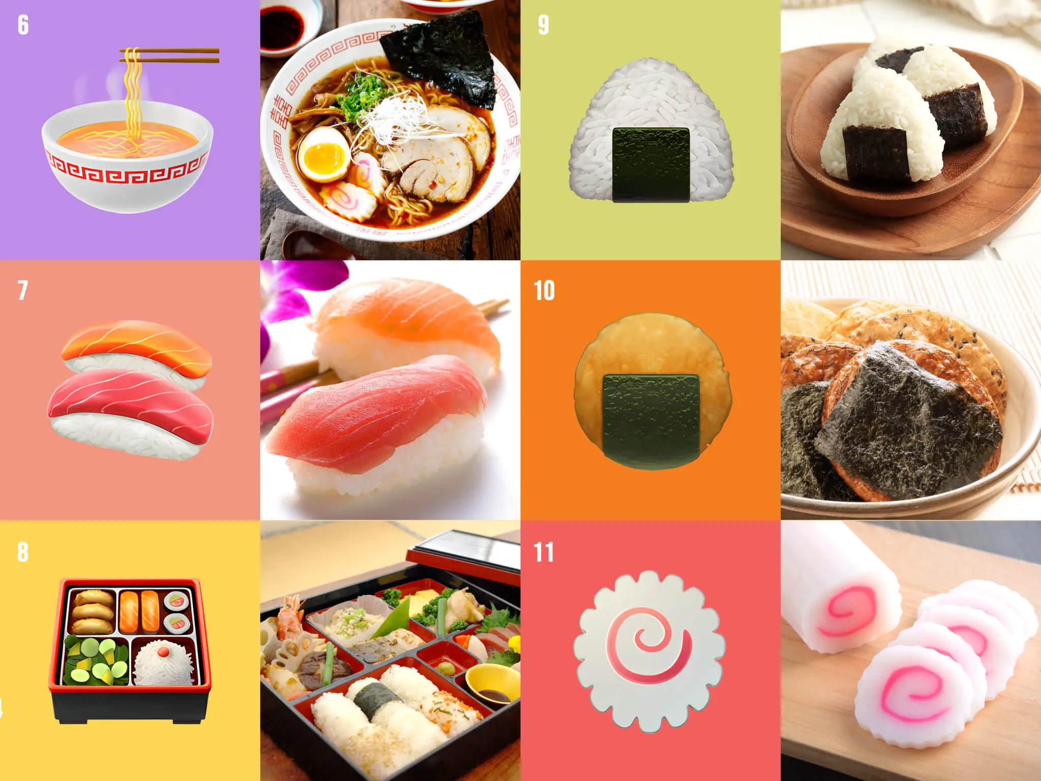 7. Sushi: Most sushi emoji will show a salmon and tuna nigiri, but some platforms display a piece of maki, or roll-type sushi.