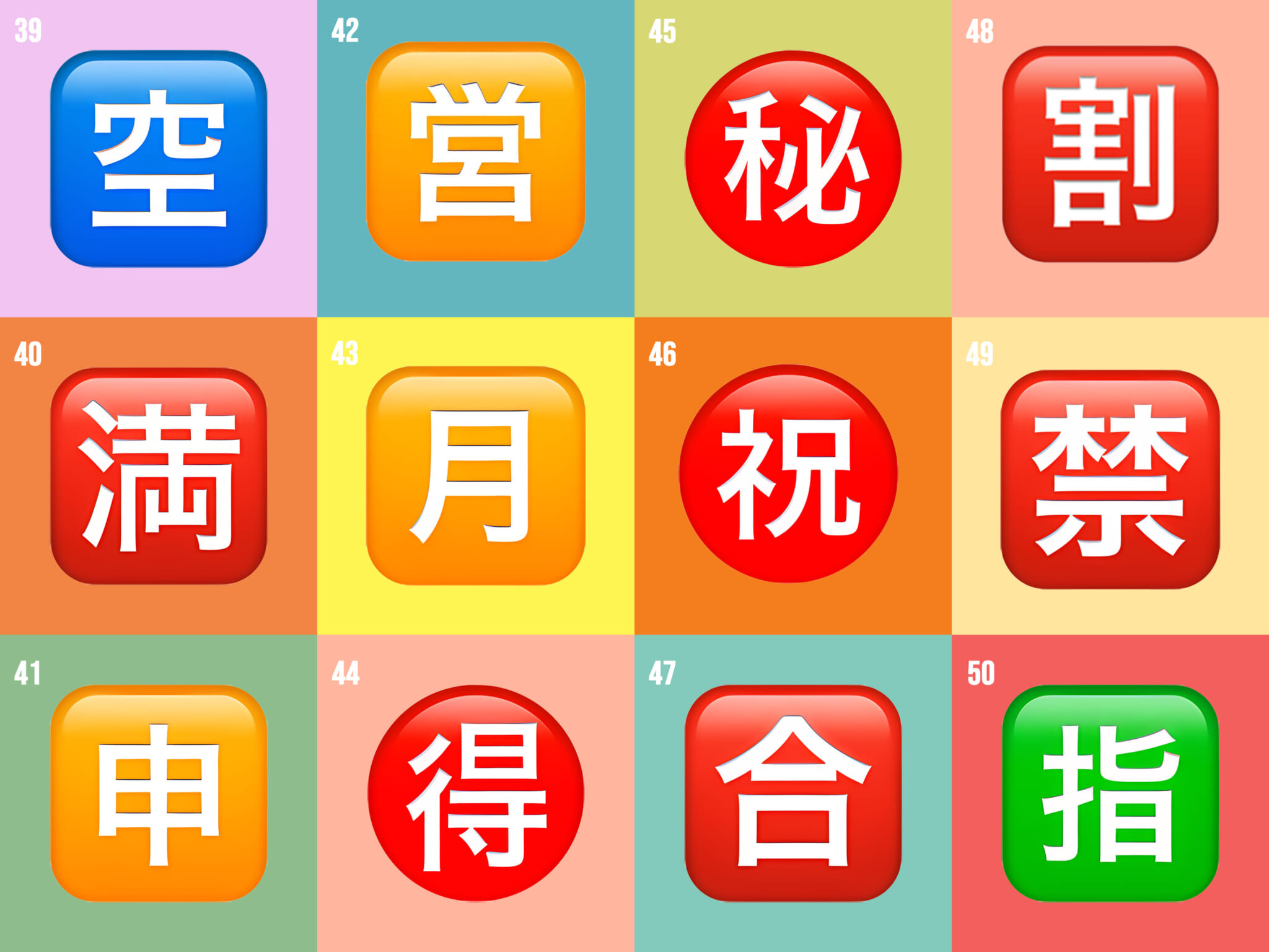 47. Japanese “Passing Grade” Button: This kanji means “fit,” “join” or “suit.” It’s often used as shorthand for gokaku, meaning “passed.” It’s an emoji everyone wants to see during juken (entrance examination) season.