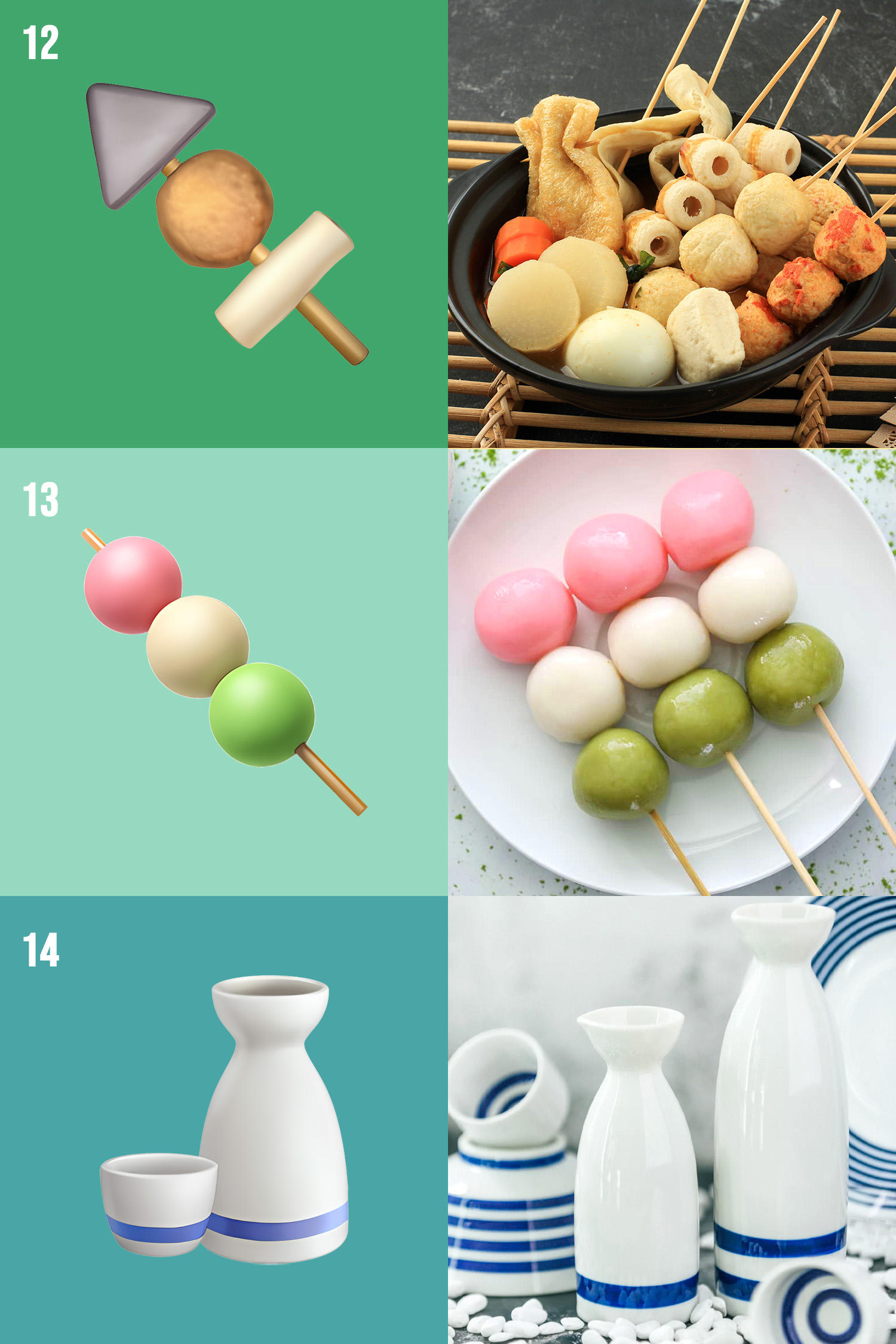 13. Dango: Dango are sweet dumplings made of glutinous rice flour. The emoji dango is a hanami dango, a tricolor variation popular during cherry blossom viewing season.