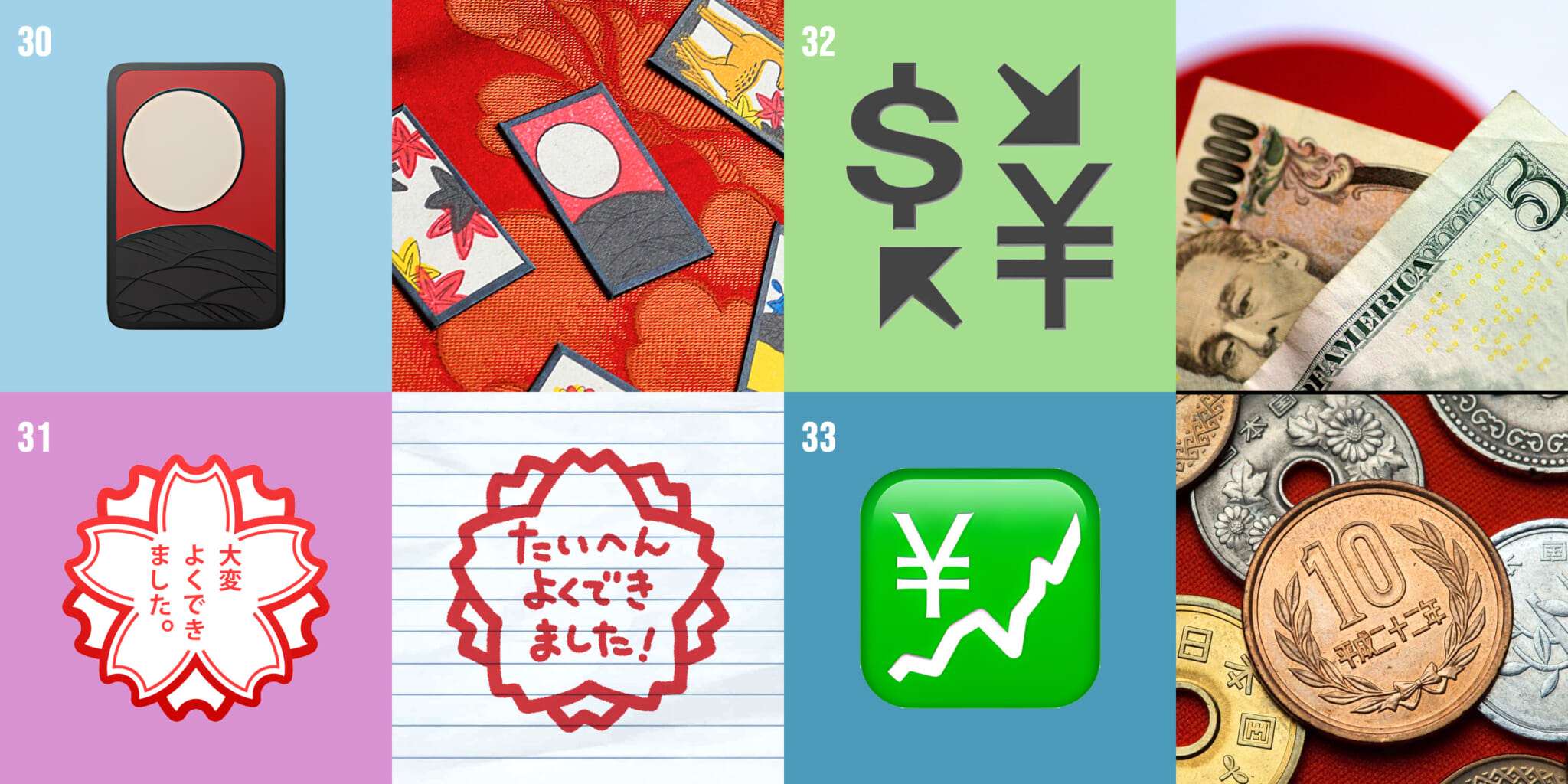 31. White Flower: This emoji echoes the hanamaru stamp that Japanese teachers use to mark a high score. It says taihen yoku dekimashita, meaning “very well done.”