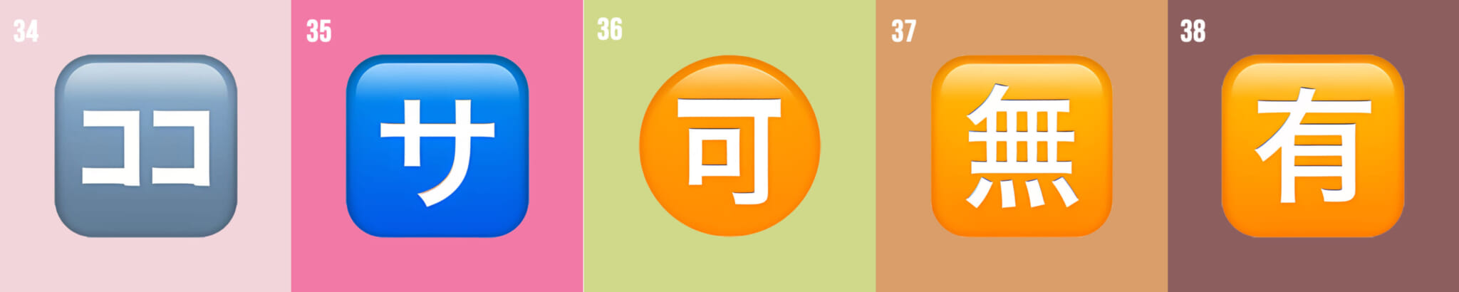 34. Japanese “Here” Button: This emoji features koko (“here”) written in katakana.