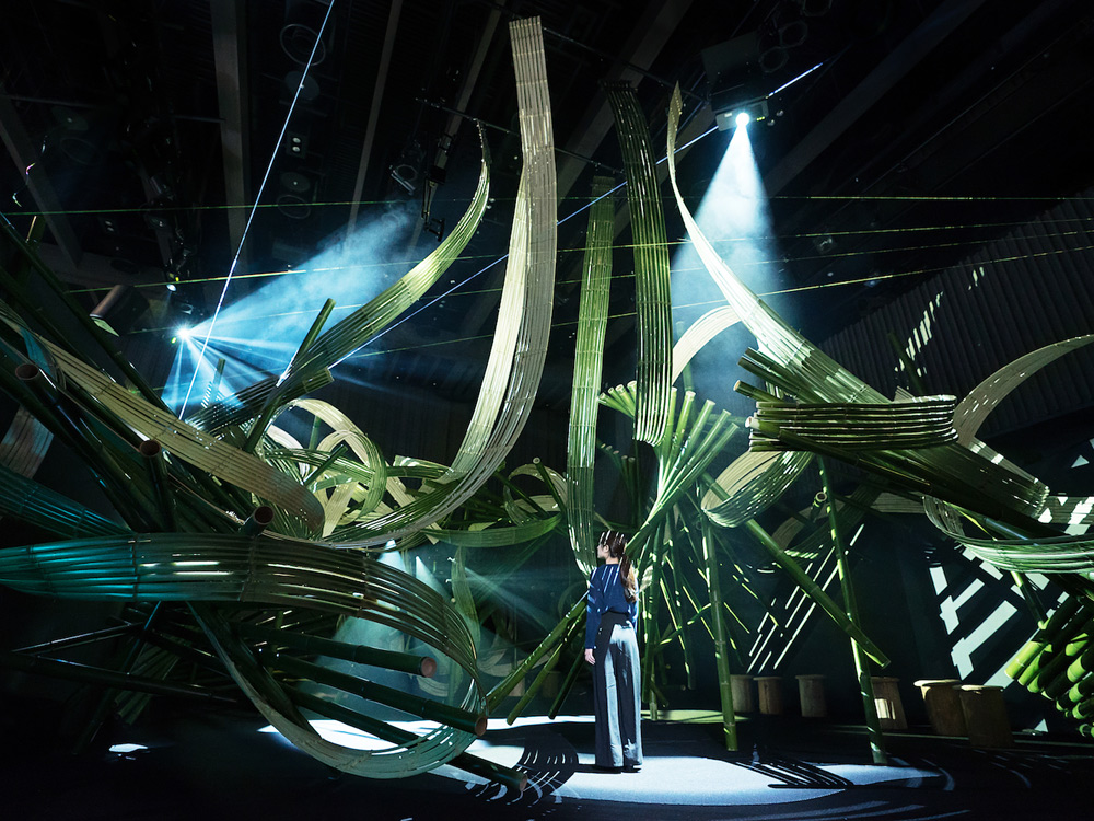 The event combines the futuristic display of flowers with performances of kyogen, a classic form of comic theatre, ikebana flower arranging, and a recital featuring the shinobue, a traditional Japanese flute.