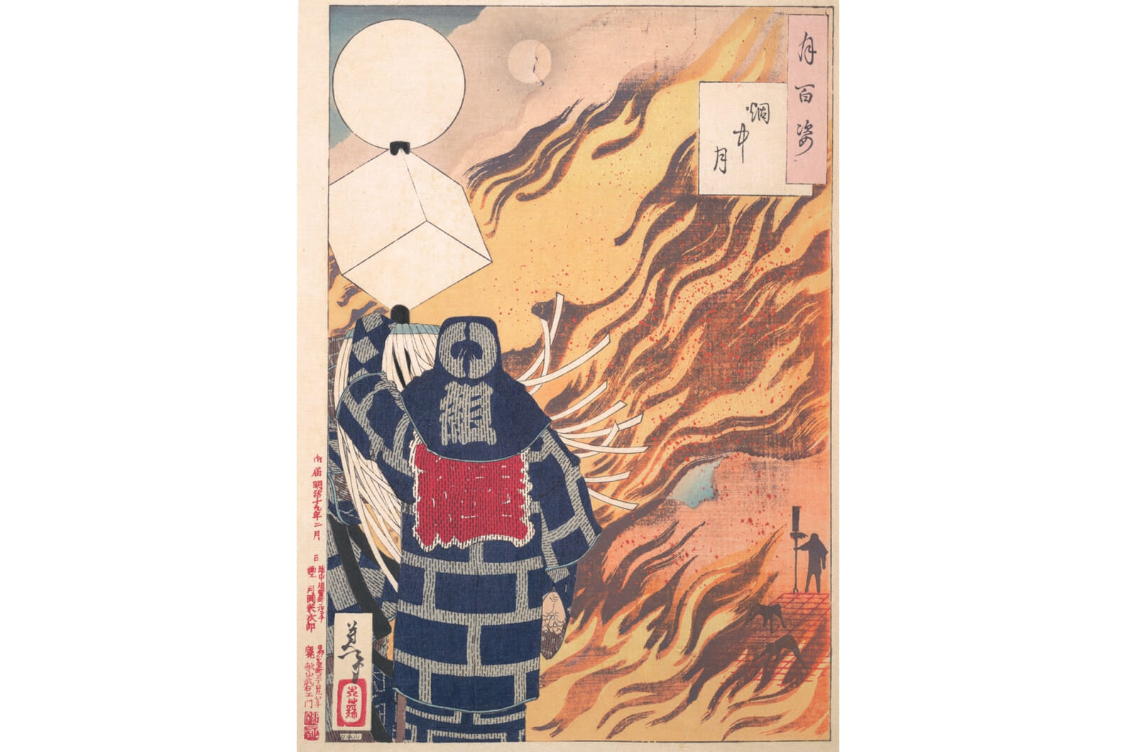 Depiction of Edo Firefighter in uniform, from “Moon in the Flame” by Yoshitoshi (1996) | Wikimedia