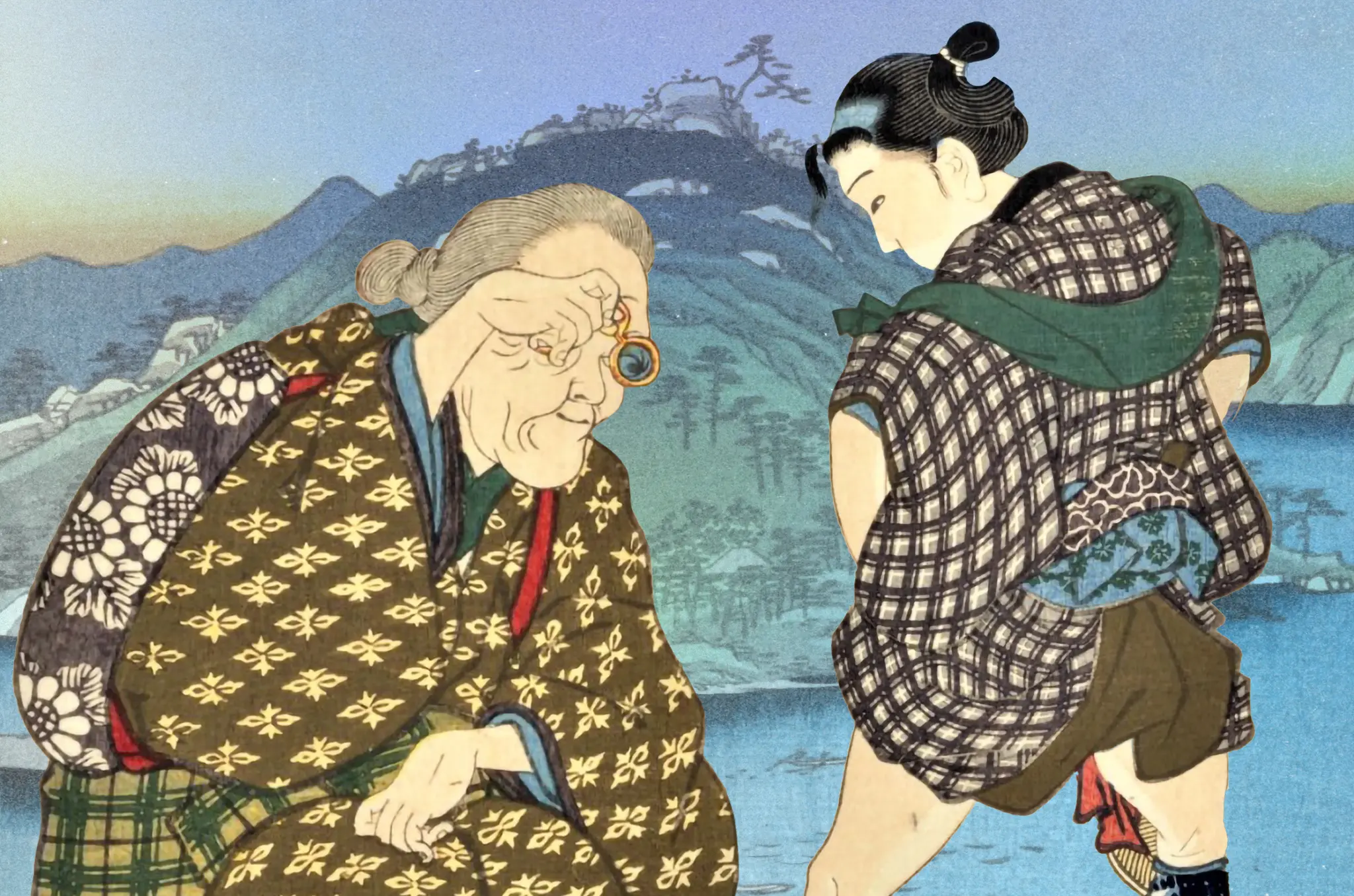 An Araijuku aratame-baba depicted in the series “Fifty-Three Stations of the Two Brushes” by Utagawa Hiroshige