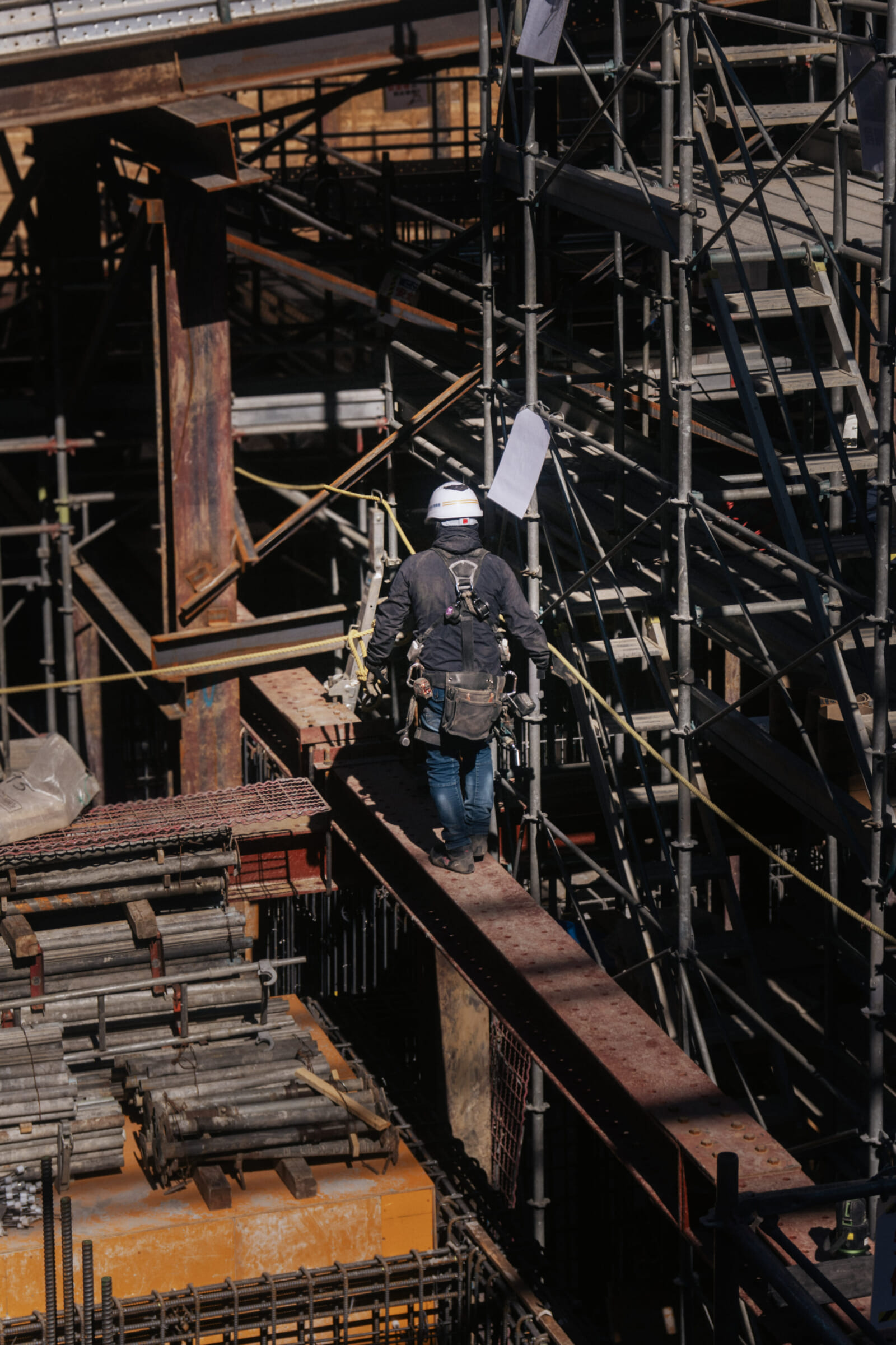 Japanese construction work has been broadly divided into different specialized trades since the Edo period: sakan (plasterers), daiku (carpenters), and tobishoku (scaffolders and high-altitude construction workers). The term “tobishoku” is made of two components: The first part, “tobi,” originates from the pickaroon (tobiguchi) used to lift wood for scaffolding; the second, “shoku,” means “work.” However, the Japanese word for “flying” or “jumping” is also pronounced “tobi,” giving the word another, more literal interpretation. “Flying work” aptly describes the daring acrobatics of these workers as they move effortlessly across steel beams and scaffolding.
