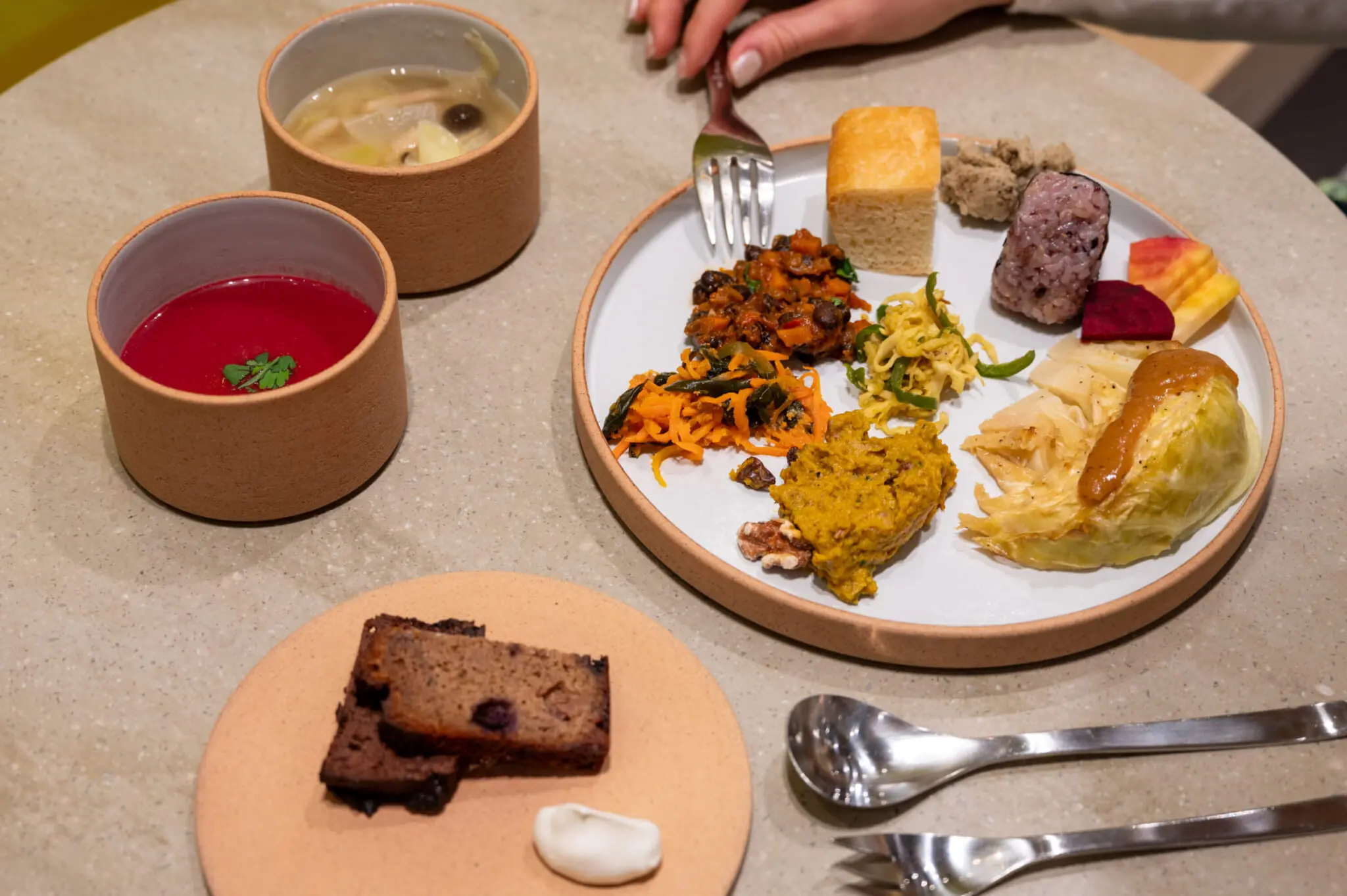 The Kitchen functions buffet-style, and guests can curate their own deli plate. Along with Eliasson’s famous recipes, like his pumpkin carrot cake and brown rice and black bean rice ball, Chef Masutani serves up his own original recipes that take inspiration from SOE Kitchen’s western influence. Ingenious dishes like amazake, carrot and wakame seaweed with ume plum flavored rapeseed and pumpkin salad with sake kasu (sake lees), yogurt and miso adorn the table. Each mouthful packs a punch with its unexpected flavor combinations, made possible by the fusion of Germany and Japan’s gastronomical traditions.