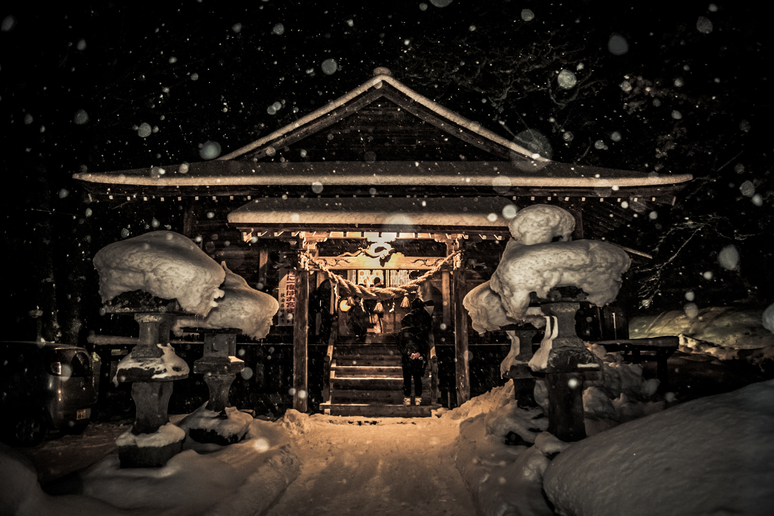 Noshu (performers) take part in a strict devotional purification process in order to attend this ritual. Of these, Mizugori, the midnight ritual of drawing water from a pond or stream, is perhaps the harshest. Nowadays, it’s only practiced in one village. We felt that it would be of great significance to preserve these precious cultural artifacts in photographs.