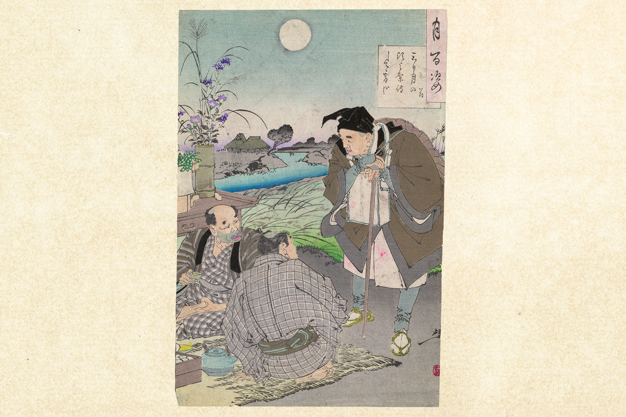 Print by Yoshitoshi Taiso shows the poet Matsuo Basho as an old man, a traveler, stopping to talk with two men having tea by the roadside.