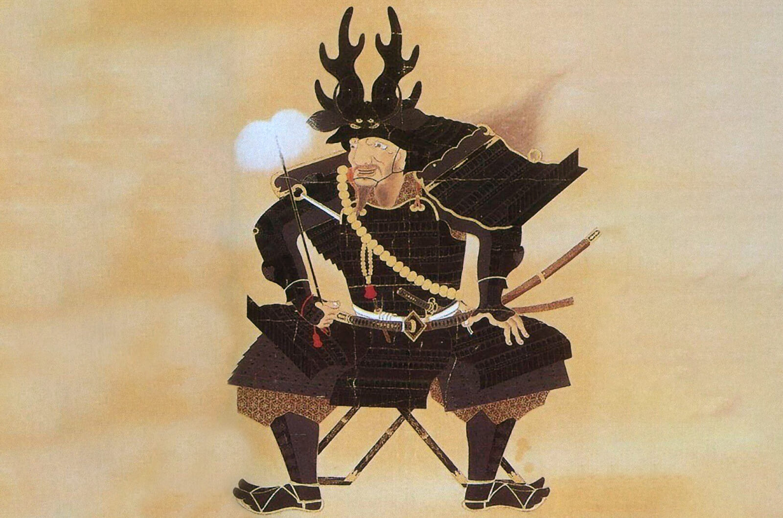 His other weapon was the Nakatsukasa sword by Masamune, the greatest swordsmith in Japanese history. Also rarely missing from Tadakatsu’s getup was a large Buddhist rosary that he often slung over his shoulder during battles. But his most distinguishing feature was his helmet with massive deer antler crests.