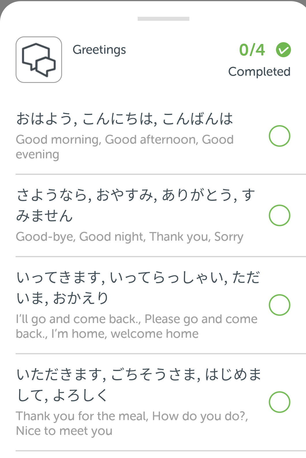 The free version of Bunpo offers most that total beginners need. Besides the JLPT sections, there is one called ‘Alphabets and Basic Words’ containing 18 categories from introductions to hiragana and katakana to phrases and vocabularies from many fields of daily life. These lessons are entirely free and they will keep newbies busy for a while.