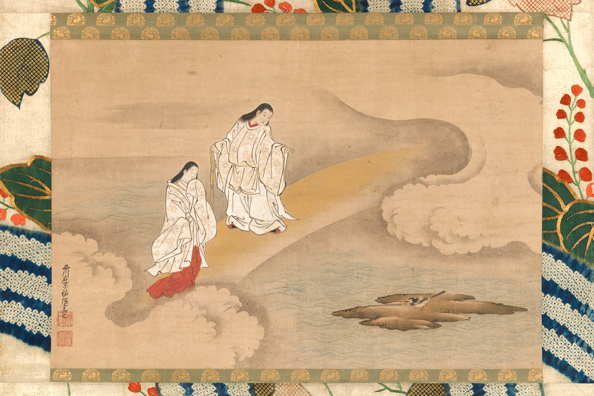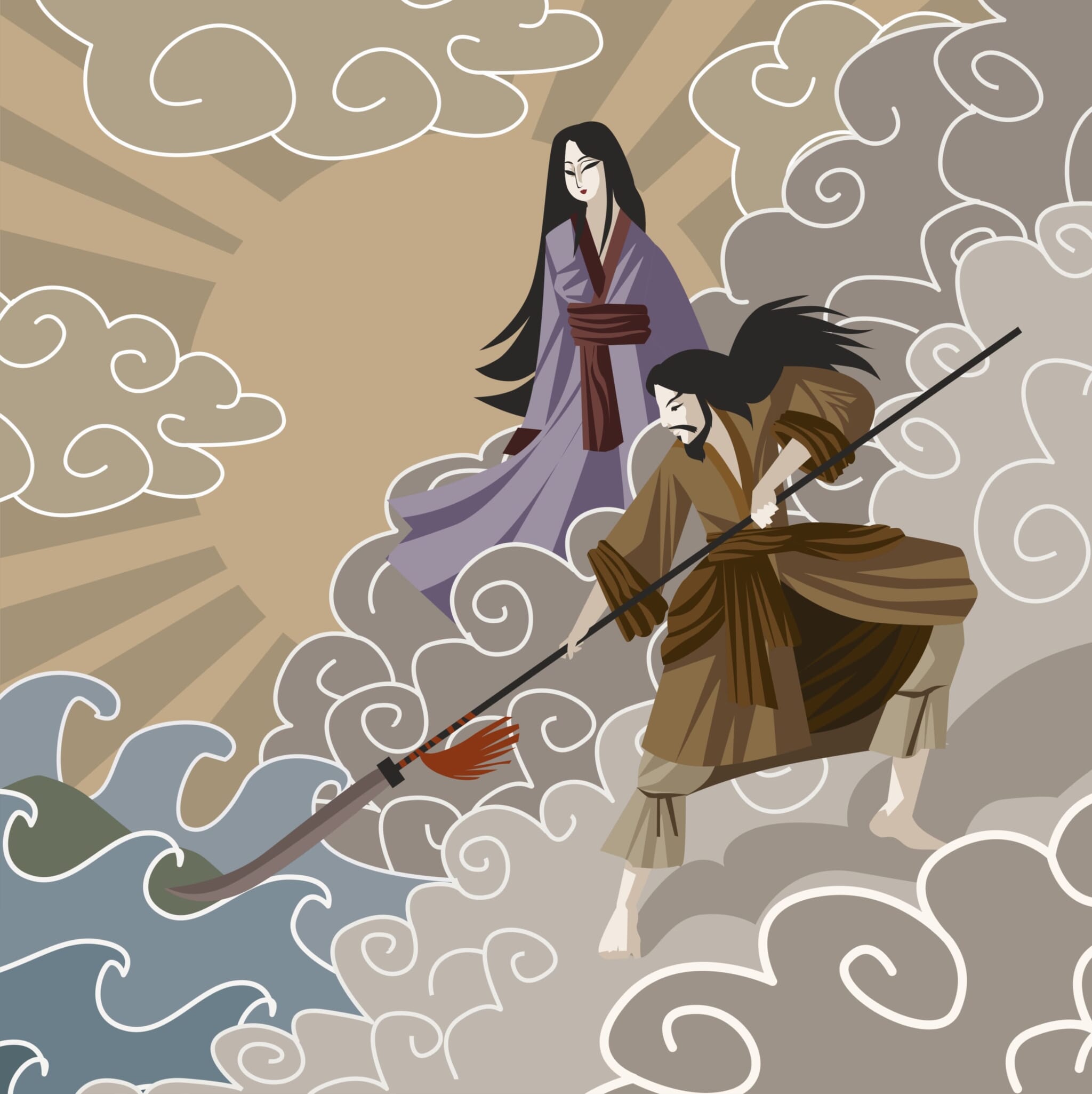 Izanami and Izanagi were tasked by the older gods with kuniumi — the birth of the country. Back then, the Earth was just a floating mass of water. Izanami and Izanagi stuck a spear into it and stirred its waters. The water that dripped off of the spear created the first island, Onogoroshima. Here the gods descended to create their palace.