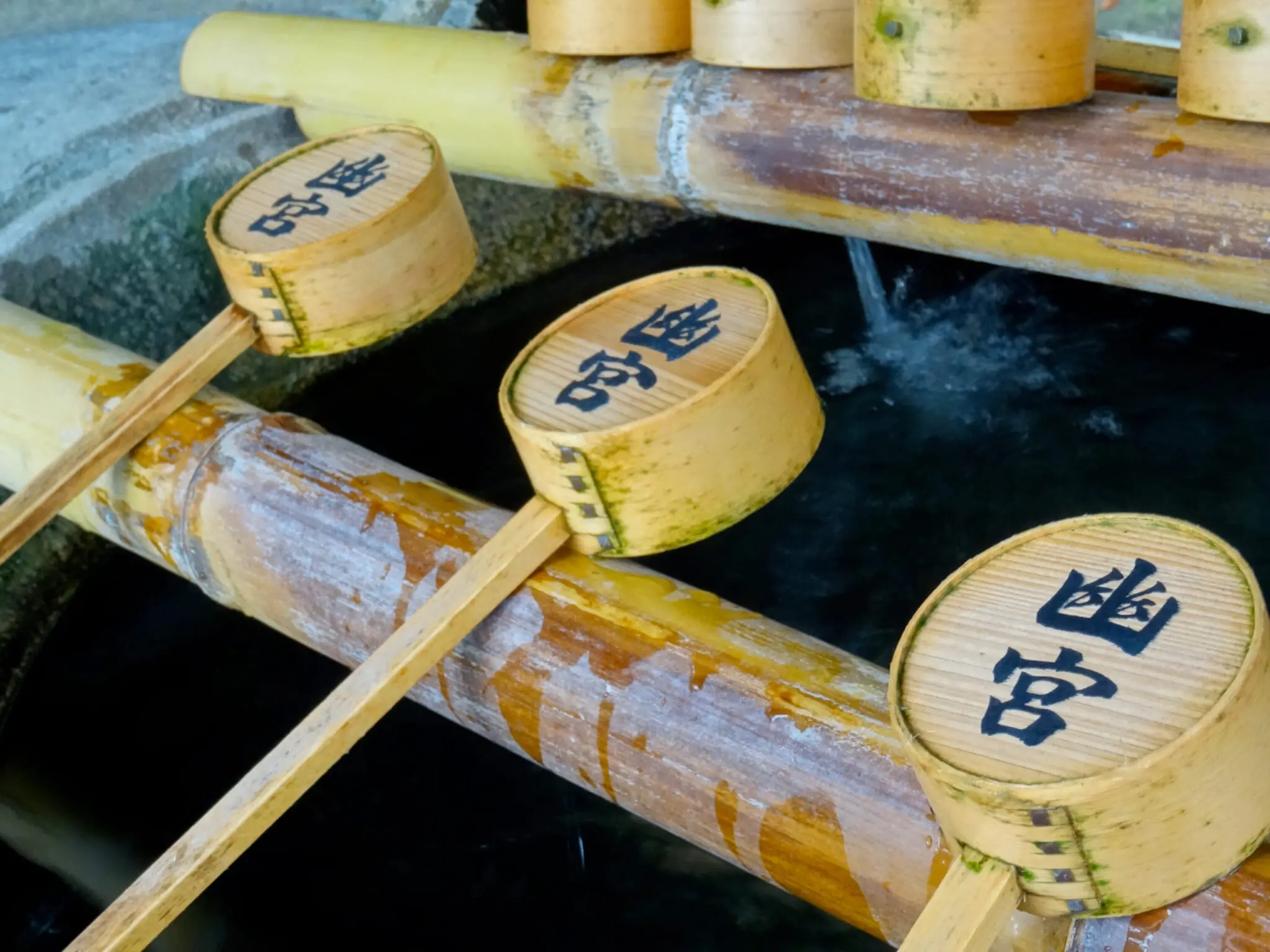 Amaterasu, the female goddess of the sun, was born from cleaning his right eye, Tsukuyomi, the genderless moon deity, was born from his left eye and Susanoo, the male god of sea and storms, was born from cleaning his nose. This gave birth to the tradition of performing misogi at the entrance of a shrine, to cleanse oneself before entering a holy space.
