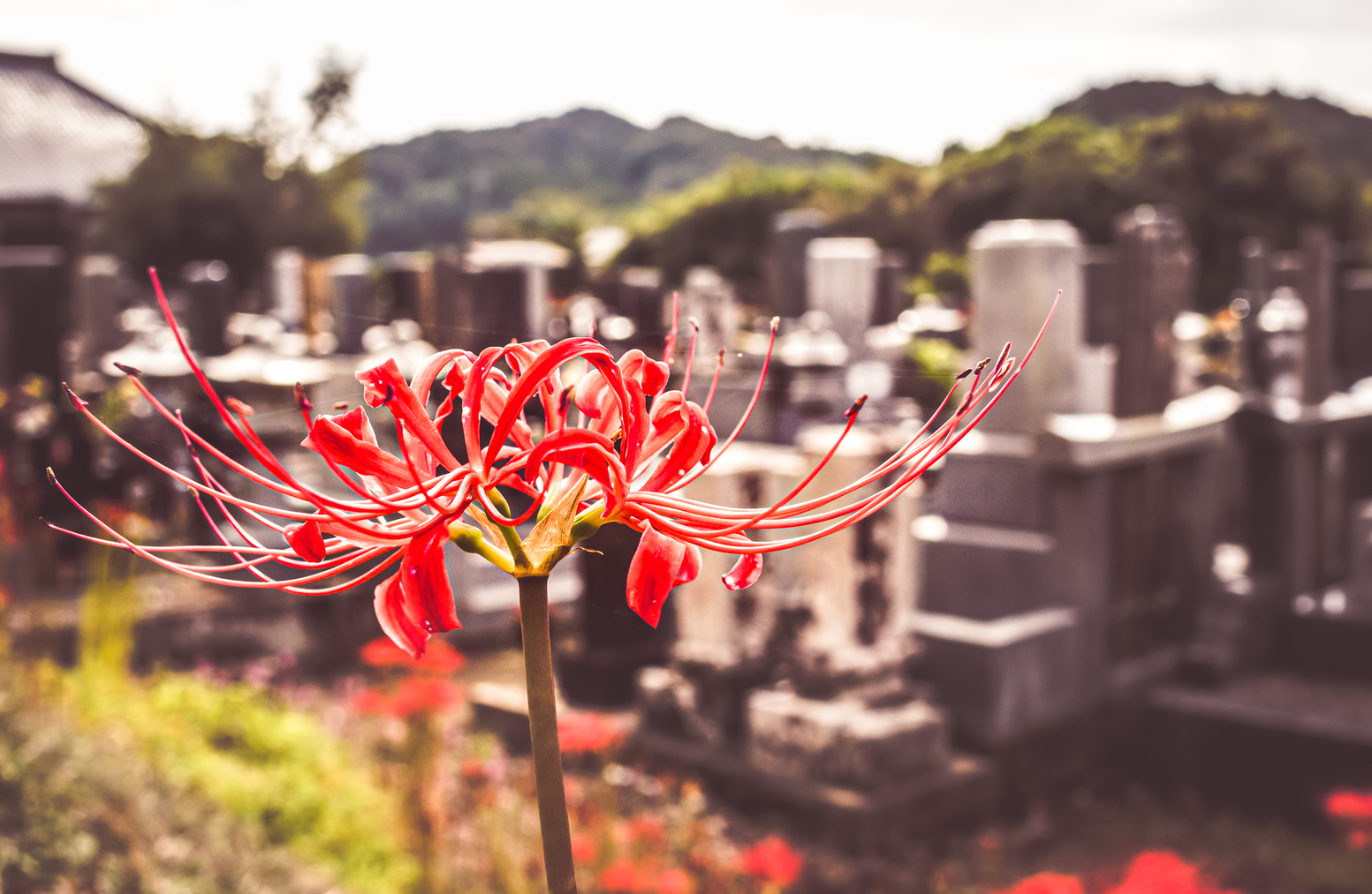 Red spider lilies have two ominous meanings attached to them. If you pick them, the dead will rise. If you take them home, you’ll start a fire. Both of these warnings are influenced by the poison the flowers hold. They were often planted around graves to ward off animals such as moles that might dig up the graves, so if you picked them and removed them, the dead would be dug up. The reason for not bringing them home was mostly because they are poisonous. So, to prevent them being eaten or taken home by children, the idea that they would start a fire was told.