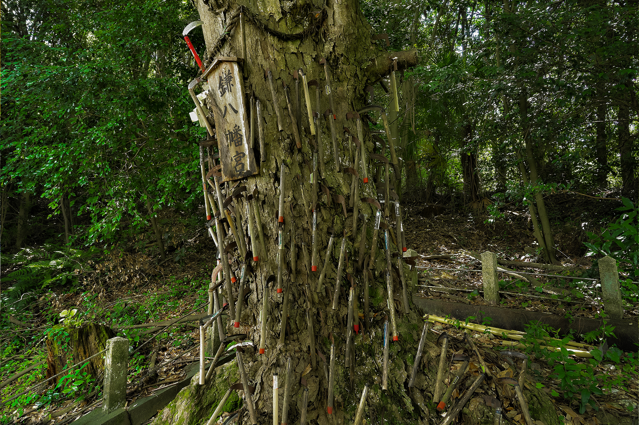 Just behind the shrine’s torii gates there is a red-barked oak tree. Today, the oak tree stands out because it is full of sickle knives. The large crescent-shaped axes are stuck deep into the tree. From rusted, years-old specimens through to shinier, newer versions, the practice of sticking knives into the tree doesn’t seem to have died out.