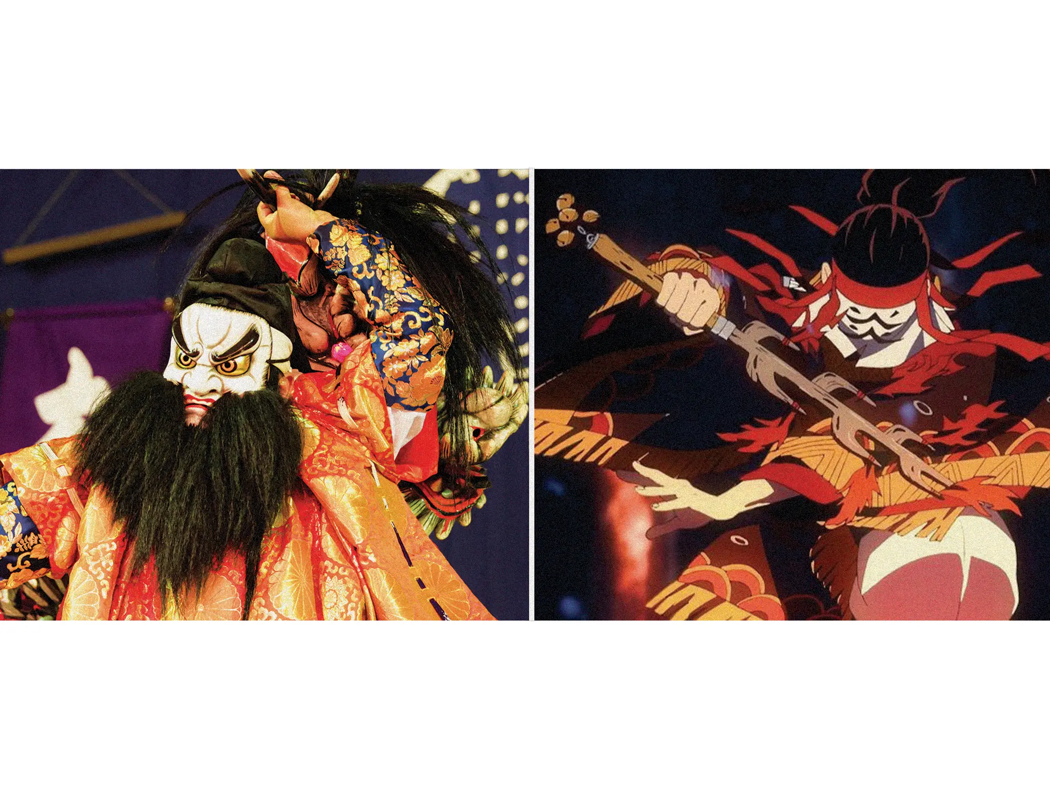 Demons taking on human form to fool their enemies also happens in the kagura play Rashomon. Battling demons is a very common theme in kagura plays. In Modoribashi, the legendary samurai Watanabe no Tsuna (the victim of the ruse in Rashomon), battles a demon near the Modoribashi bridge in Kyoto, cutting off the monster’s arm and causing it to fly away. The play Tamura is similarly straightforward: A great warrior, here Sakanoue Tamuramaro, hears news of a demon, goes to fight it, and defeats it. Splash a few buckets of blood on it and you have yourself the elevator pitch for Demon Slayer. But kagura’s influence on the manga and anime goes much deeper than that.