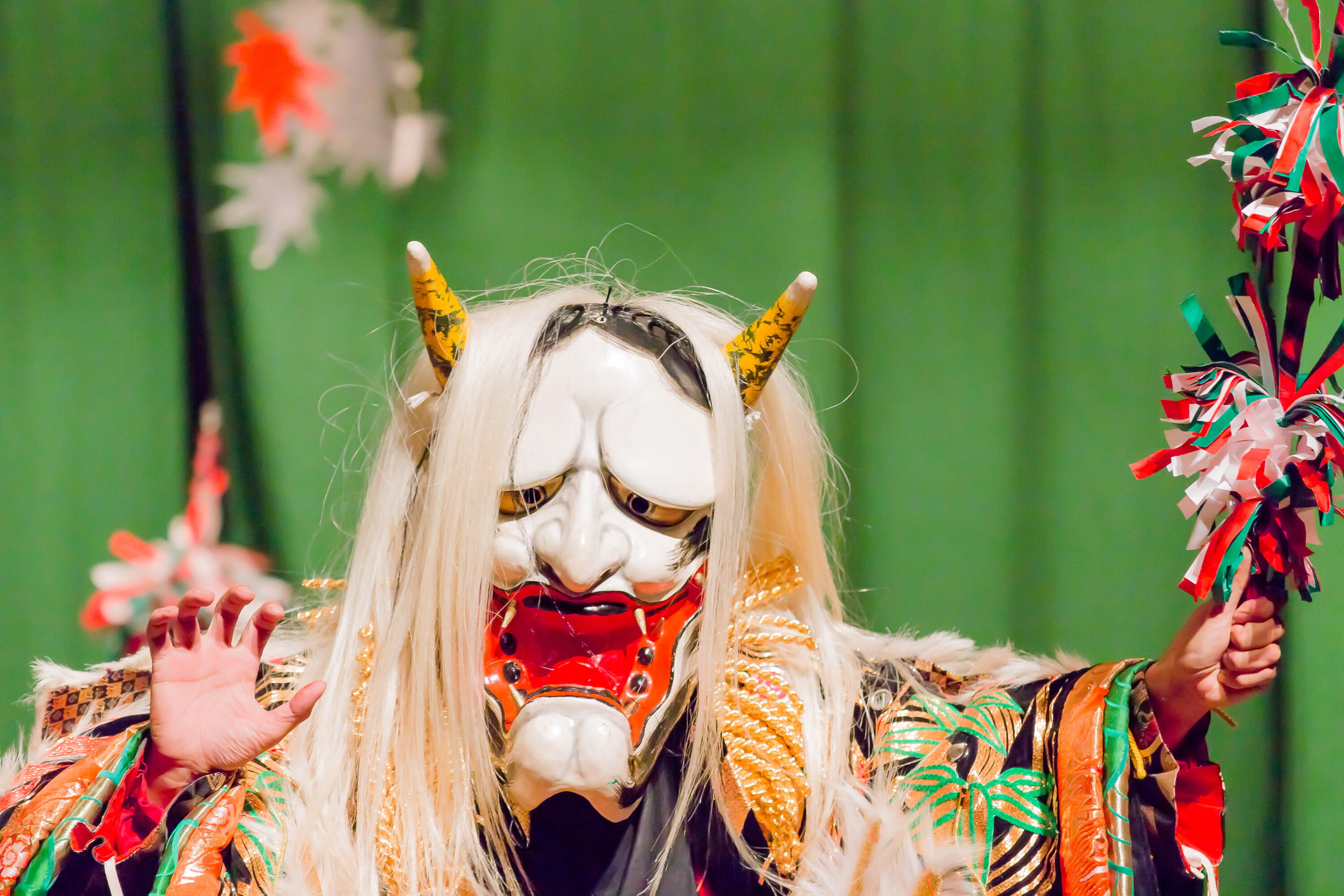Some say that kagura is the oldest performing art in Japan. Today, it primarily takes the form of stage performances with singing, music and a lot of dancing in elaborate costumes to honor the gods. Kagura comes in many varieties, but broadly speaking, the dance can be classified into two groups: the regal mikagura that evolved at the Imperial Court and is full of pomp and ceremony, and the folk satokagura that developed outside the Kyoto palace in hundreds of different mountain villages, each one adding a bit of the local flavor to the tradition. So far, so no demon slaying. But if we go back further in time, a few familiar things start to emerge.
