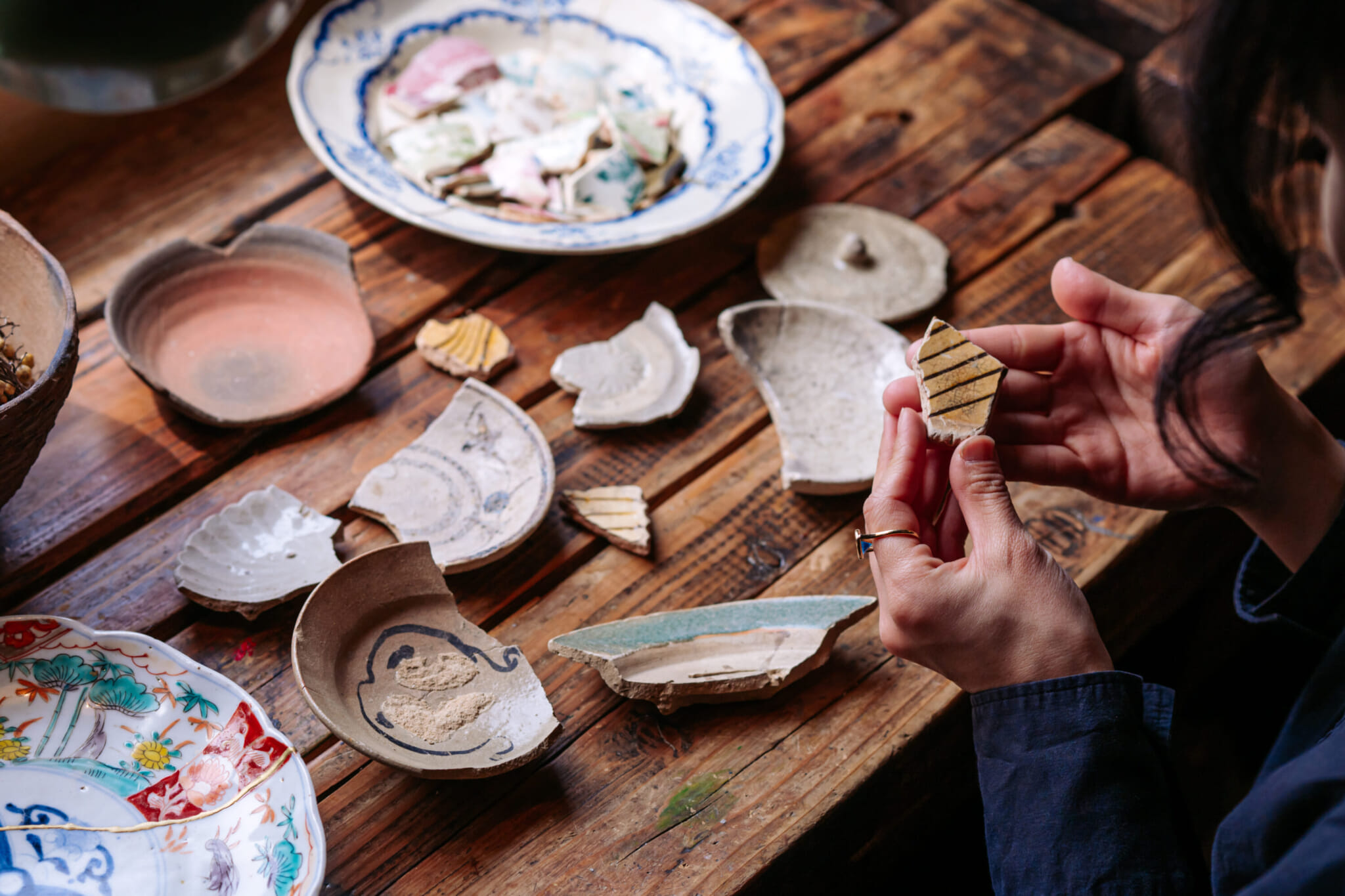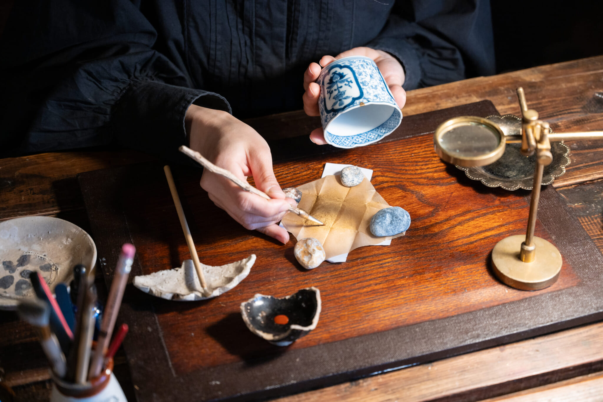 On a quiet side street in Tokyo’s Ogikubo neighborhood, sunlight streams through the windows of a small antique studio filled with ceramic fragments, brushes, powdered gold and bowls in various stages of repair. The air carries the earthy scent of lacquer while the yellow and silver trains of the Chuo-Sobu Line occasionally rumble by.