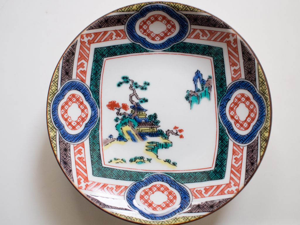 Iroe is the most colorful of the Kutani styles, with five different colors used: yellow, green, red, purple and Prussian blue.