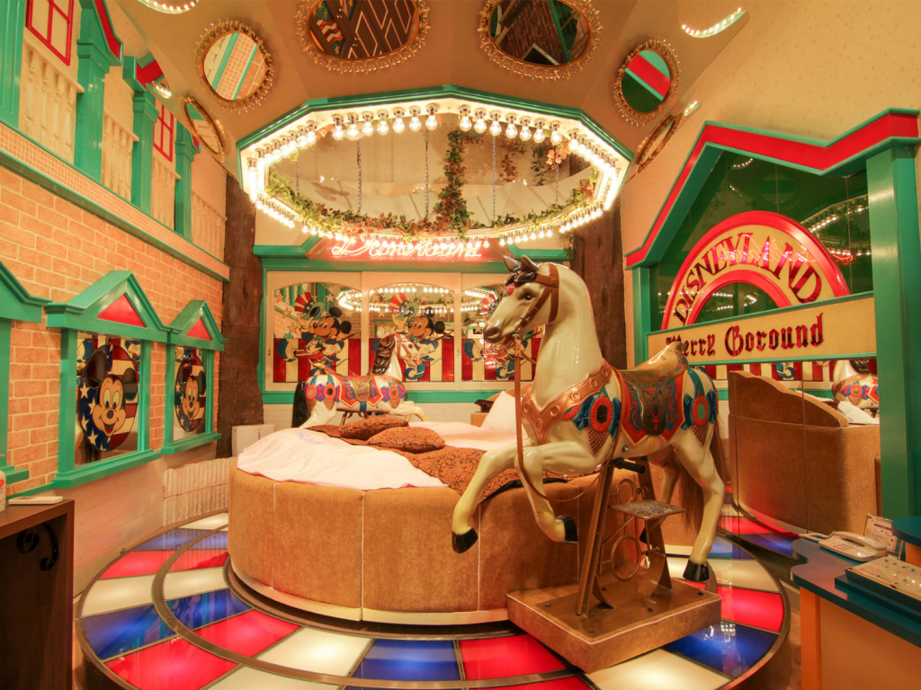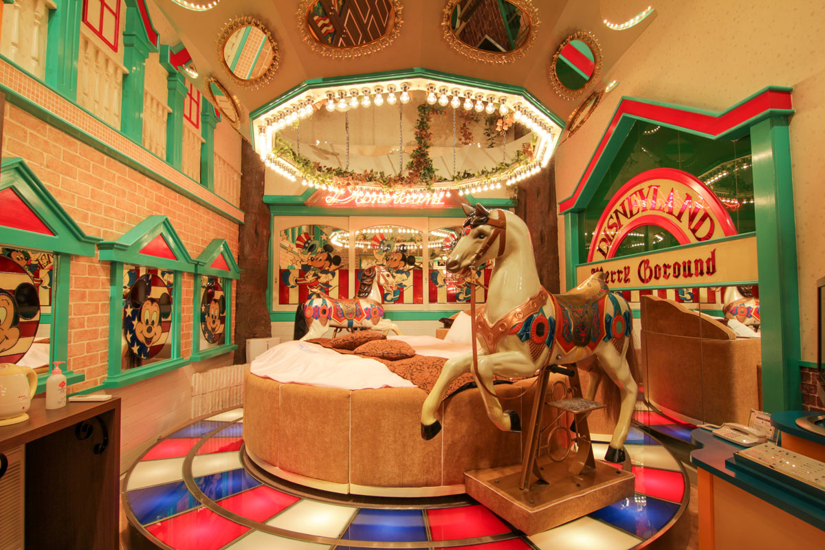 The discovery of this simple retreat with over-the-top décor is at the heart of Onitsuka’s ongoing passion for love hotels. There were never two rooms exactly the same, and so she wanted to see them all. When talking about the design of Showa-era hotels, she reveals that round beds were particularly favored and designers weren’t afraid of incorporating some mechanics, too. One of her favorites was inspired by the merry-go-rounds at Disneyland. On the walls were a series of Mickey Mouse graphics, which gave the room a nostalgic 20th-century Americana feel. Over the bed was a circle of lights, a dropped ceiling mimicking the trunk of a carousel. On the walls were trims of windows and doors that resembled the style of small-town county fairs. Around the bed were two mechanical horses. Before I can ask, she says, “Yes, they spun.”
