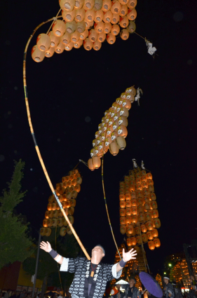 Legs tensed and set apart, the performer looks up, gauging the wind, feeling the sway of the long bamboo pole balanced in his open palm. The pole moves with the breeze, its 46 lanterns dangling like heavy-headed stalks of rice, golden before the harvest. Slowly the performer raises his hand, elevating the 12-meter-tall stalk of glowing lights higher into the air. As he smoothly shifts the base of the pole to his shoulder, lower back, and forehead, it is hard to tell whether or not the 50-kg pole has become an extension of the performer, or part of him. For a few minutes of pure concentration, there is just this one man and the tall lattice of bamboo and light—the Kanto. And then, as if able to sense the performer is at his limit, a teammate comes up for a turn. The Kanto is passed and the dance begins again.