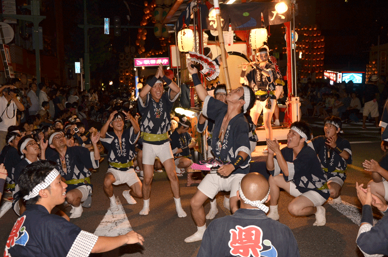 While the daytime is a show of technique and mastery, at night the performance takes on a mysterious feeling. After sunset the Kanto are carried out once more. One by one the lanterns are lit. And then, to the sound of drums and flutes, more than 200 Kanto are slowly lifted into the air. These clusters of lanterns stretch down the length of Kanto Dori. Spectators line the streets, shouting praise and encouragement. The main event of the festival has begun. For the next hour and a half, the air is filled with music, shouts and cries of “Dokkoisho! Dokkoisho!” (Heave, heave!) as the performers maneuver and pass off the Kanto to one another. Looking up it is as if the Kanto are mysterious illuminated reeds blowing and shifting in the wind.