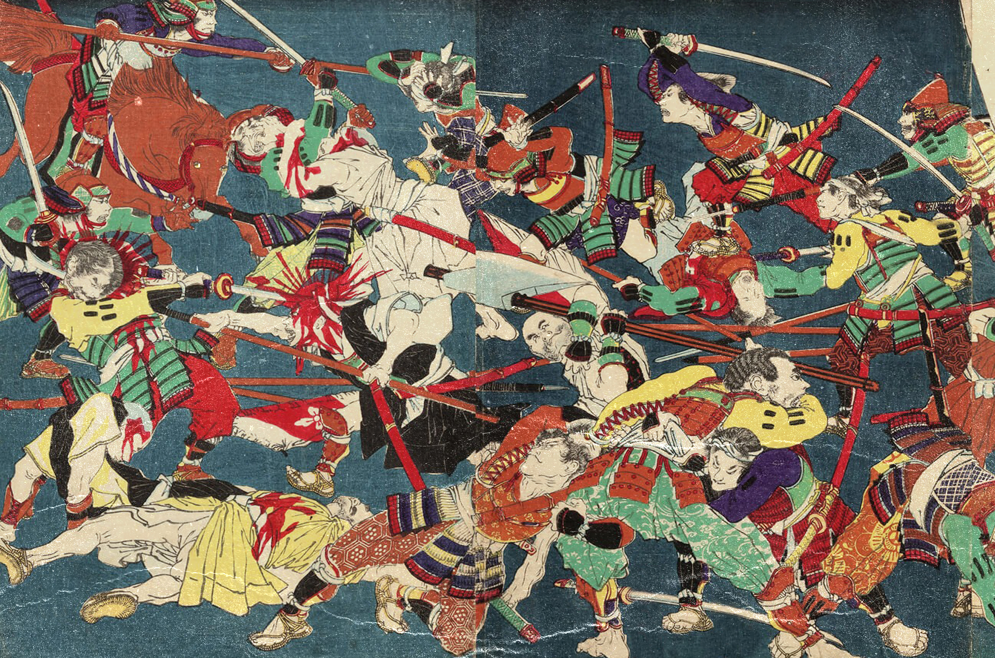 “Battle of Ishiyama Honganji” by Toyonobu (1859-1886) | Wikimedia, edits by TW