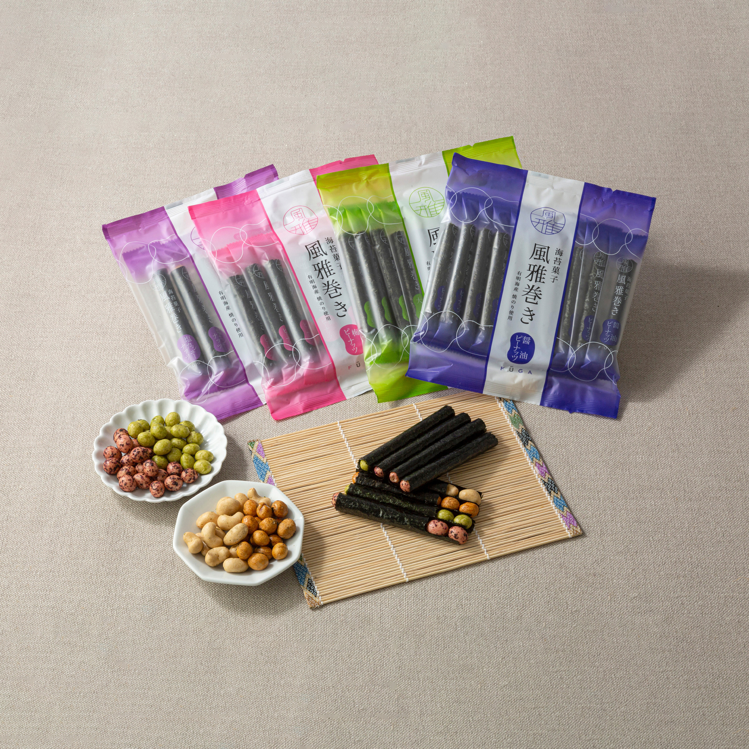 Crispy and crunchy, these Fugamaki will satisfy your savory snack cravings. Different beans are coated with a crunchy batter, then hand-wrapped with delicate nori. Enjoy traditional flavors like soy sauce, wasabi and plum.
