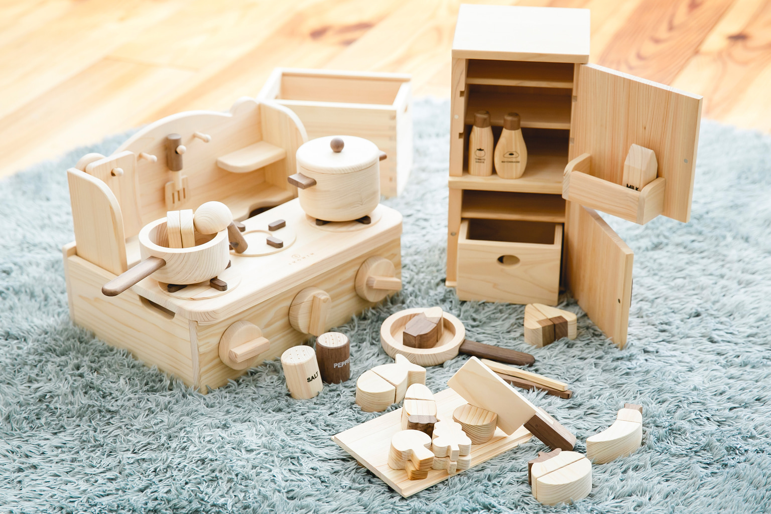 A set of wooden toys that resembles a Japanese bento box, handmade from wood sourced from forests in Hiroshima Prefecture.